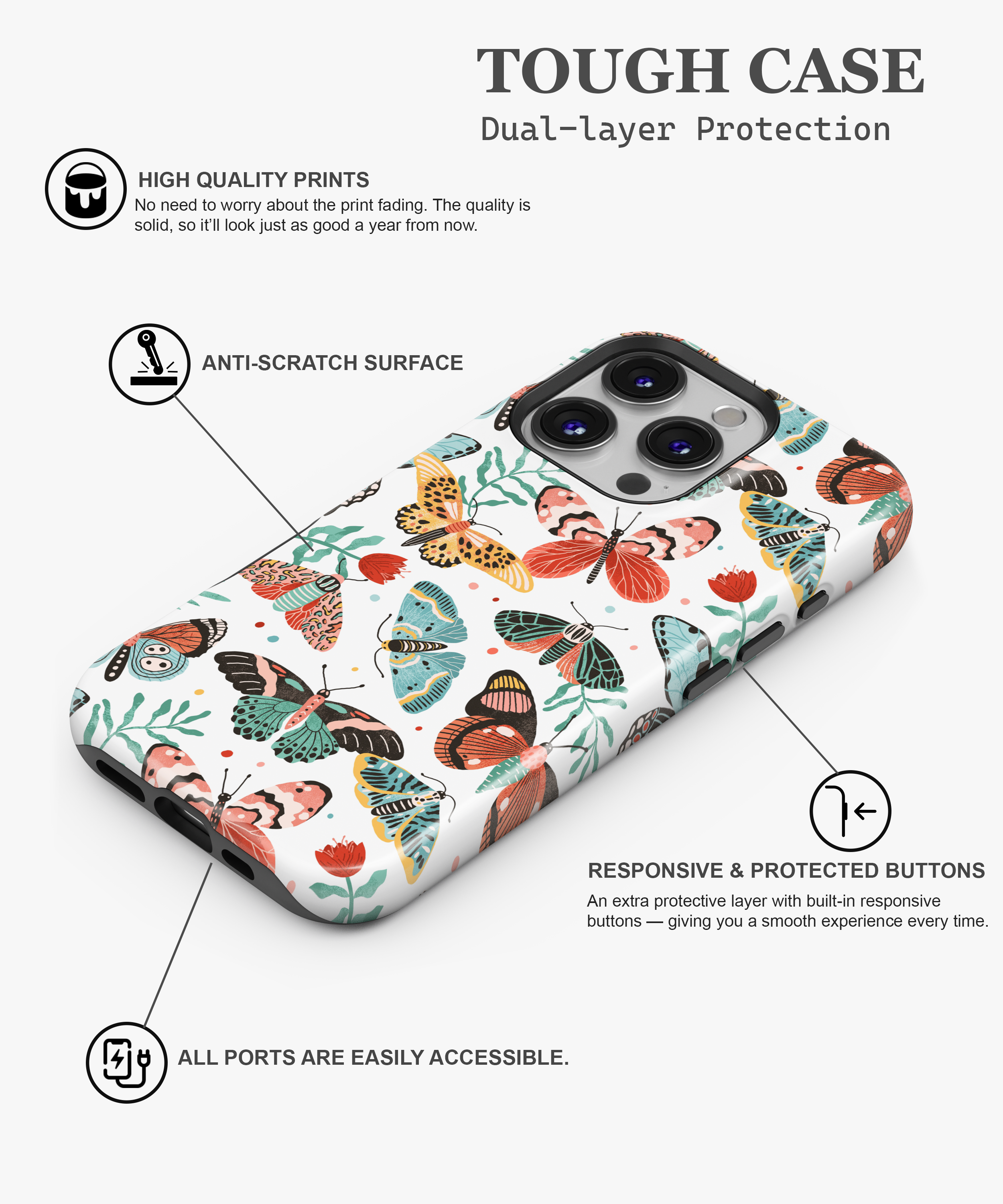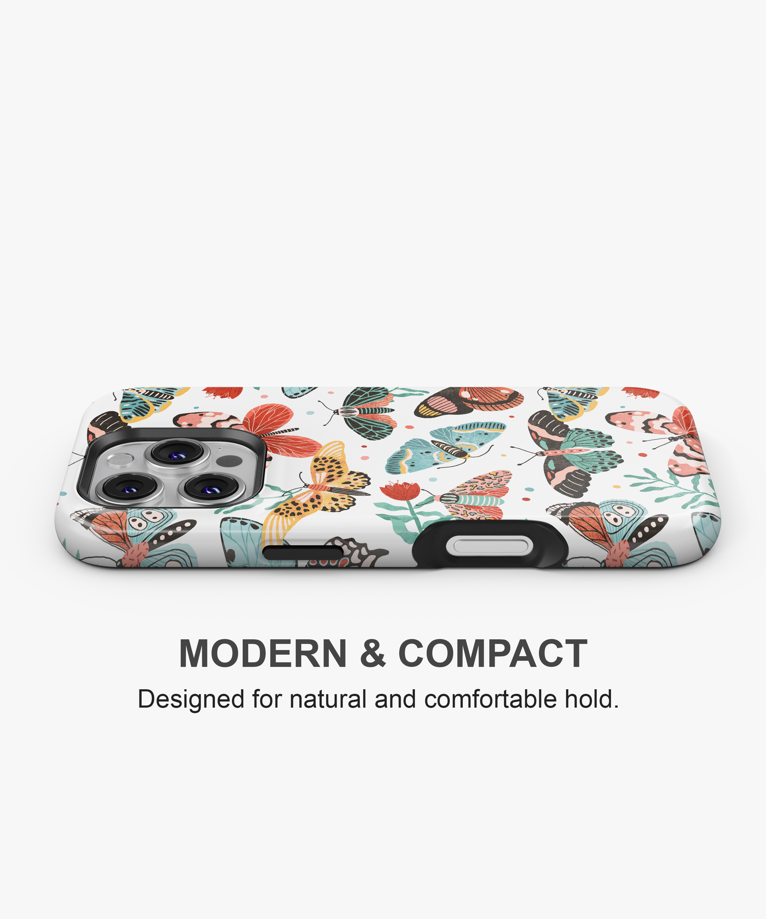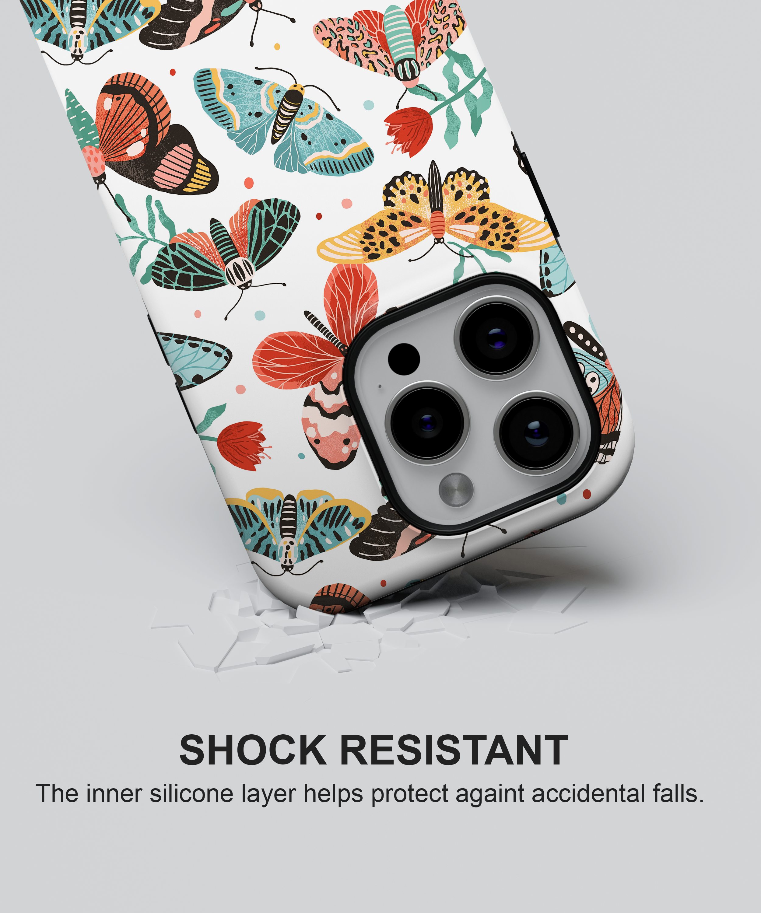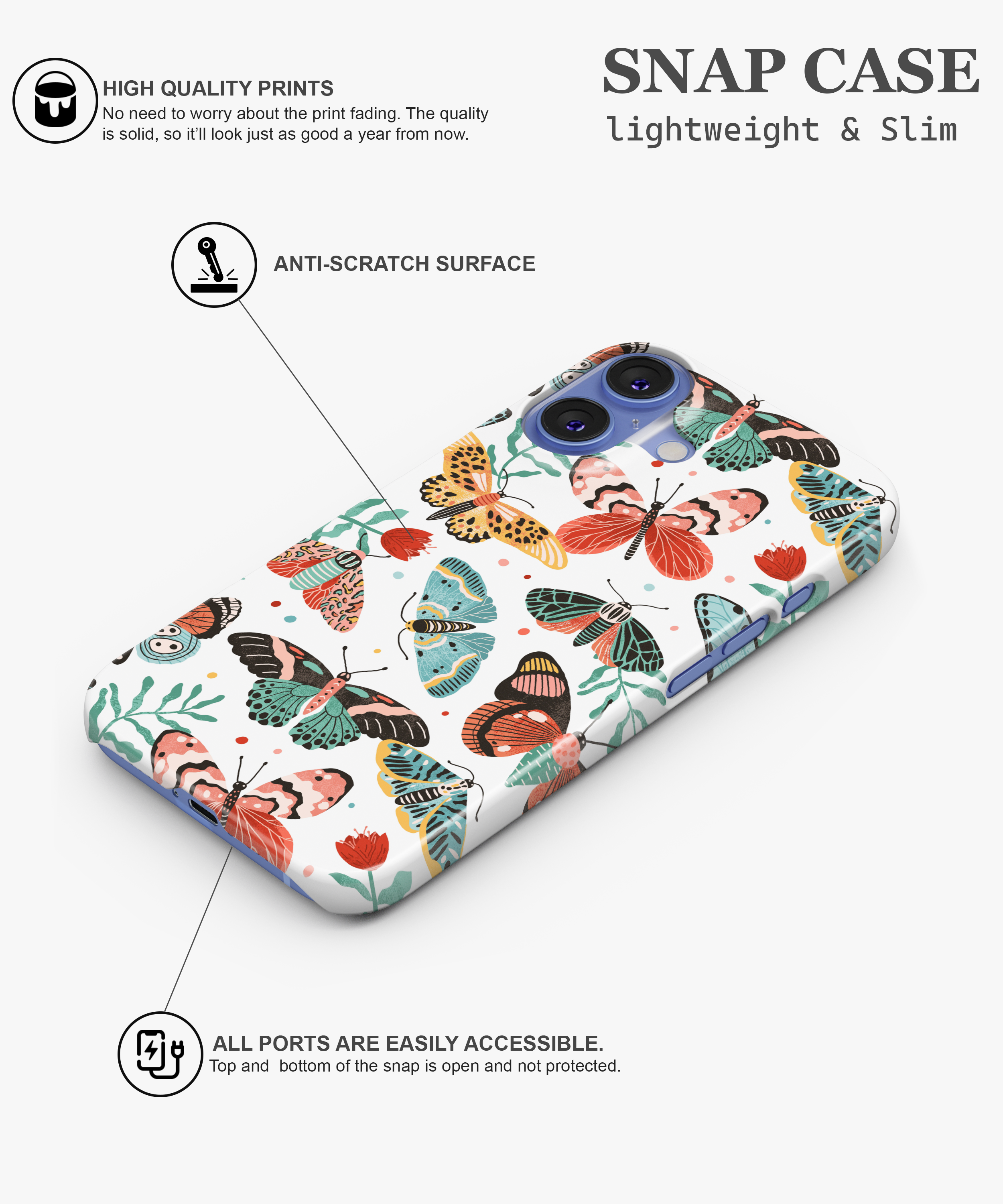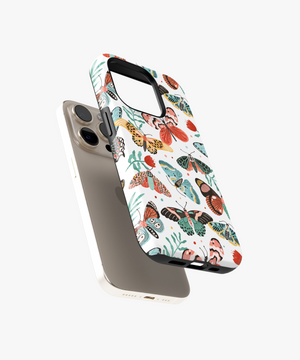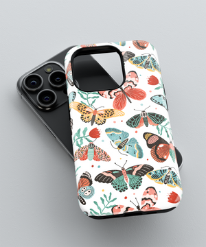 This case has fun butterfly and moth pictures in many colors on white. It protects your phone from drops and scratches. It is thin and easy to hold.