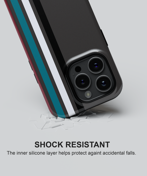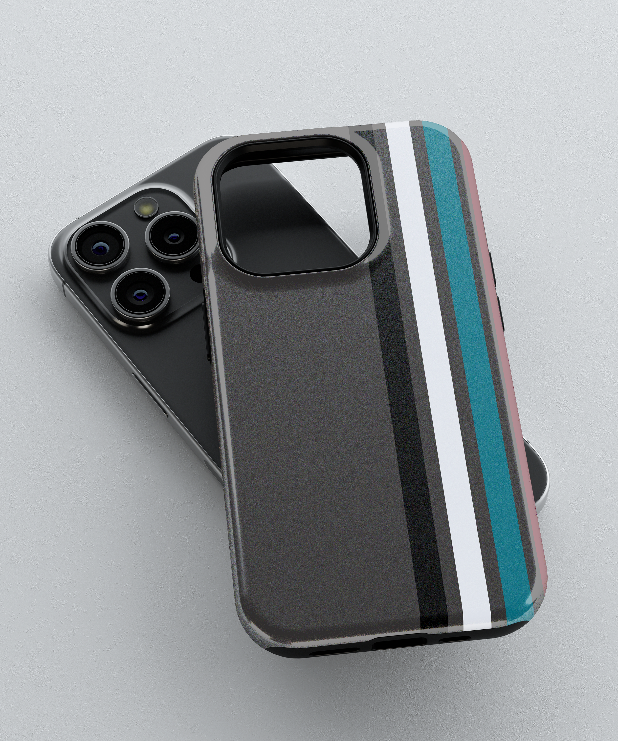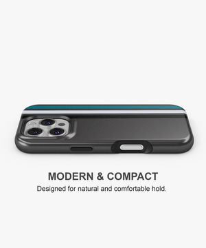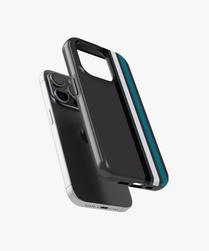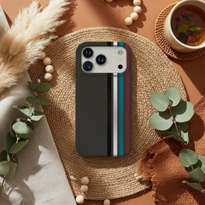 Sleek charcoal phone case with vertical racing stripes in black, grey and teal for a clean, modern motorsport look. Slim yet protective, this striped cover guards against daily drops and scratches while fitting popular iPhone, Google and Samsung models comfortably in your hand or pocket.