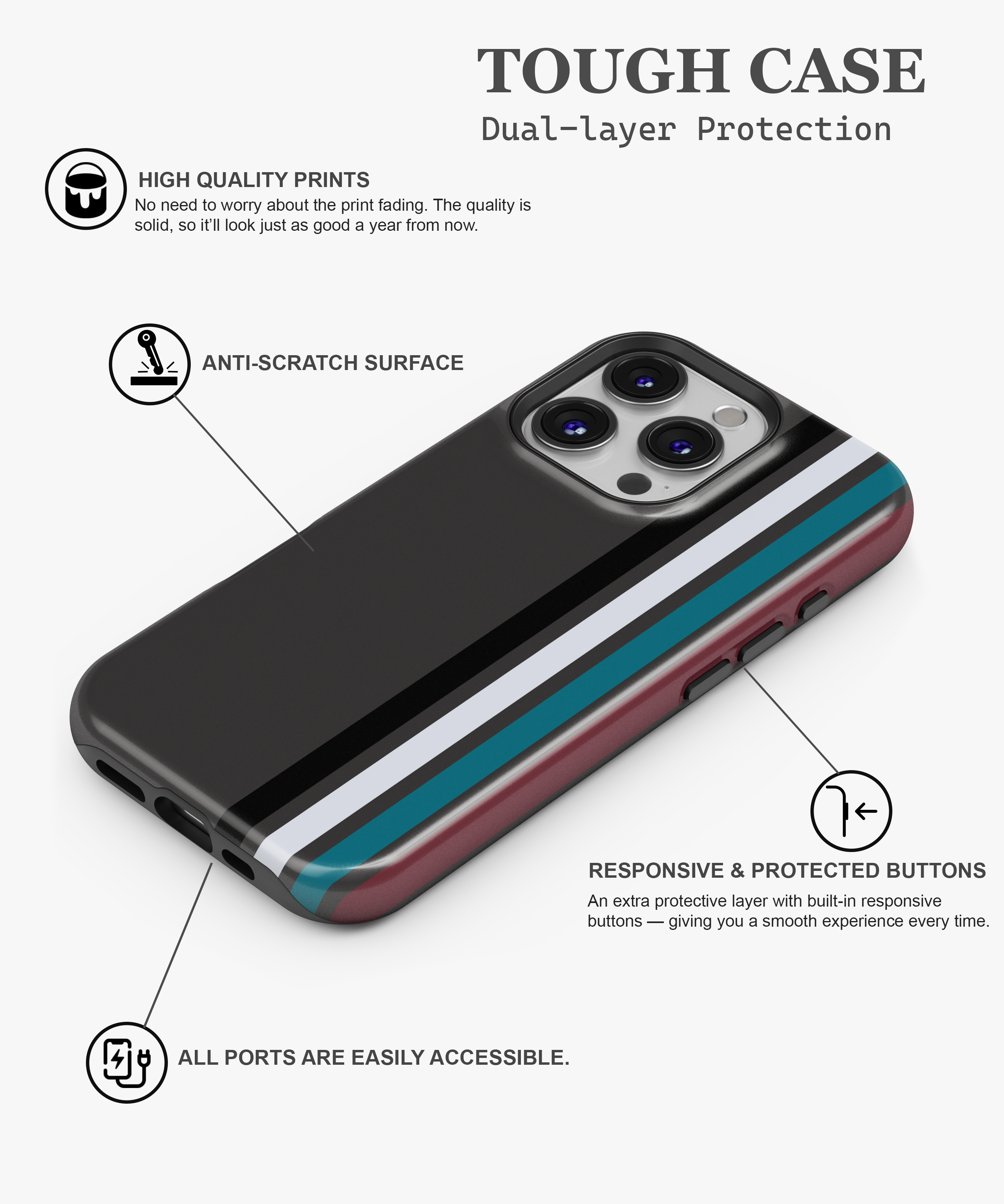 - Tough Cases: Hardshell PC exterior & inner soft TPU layer
