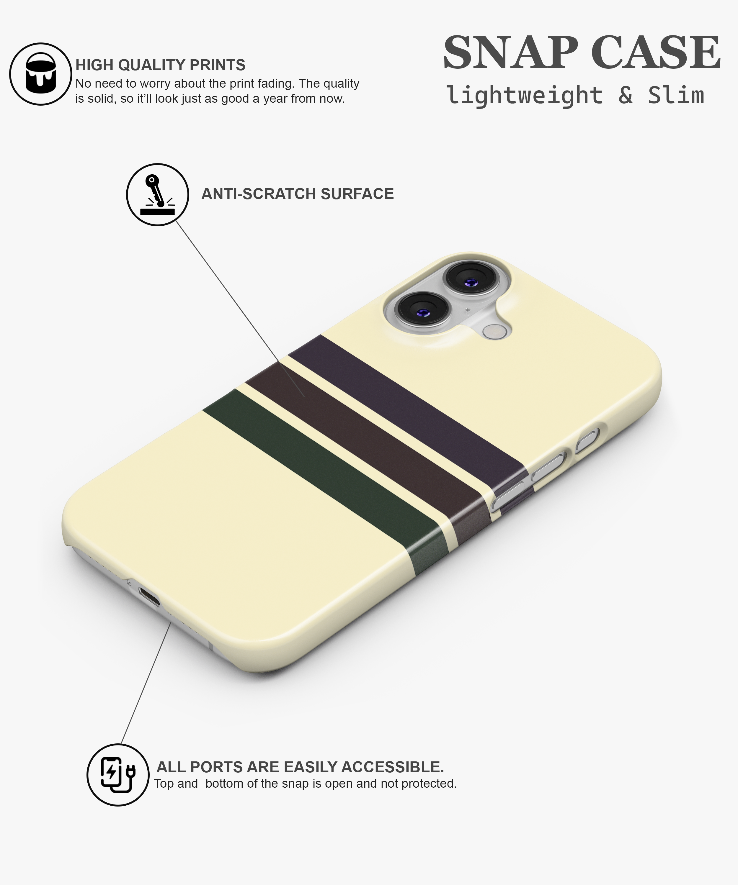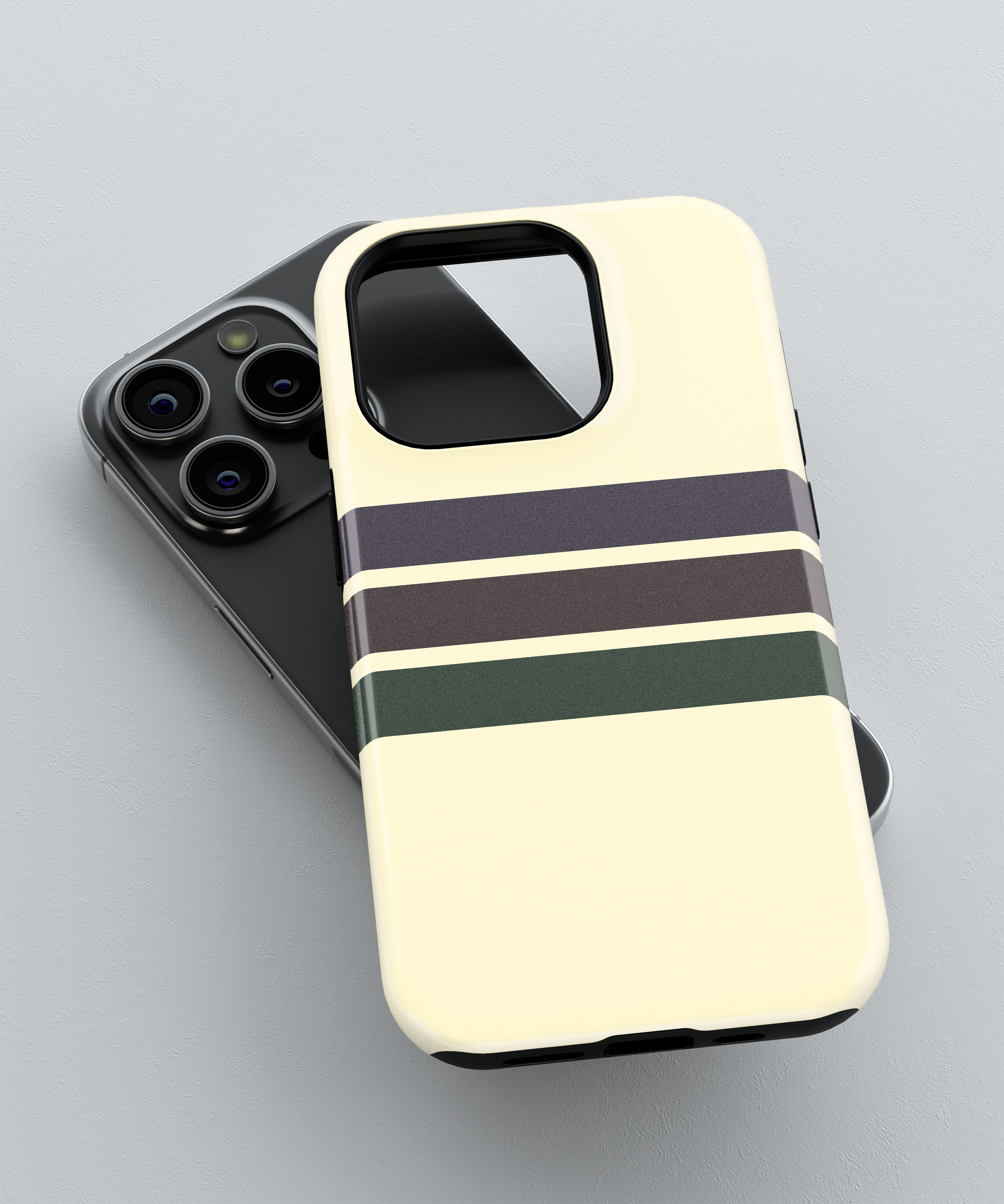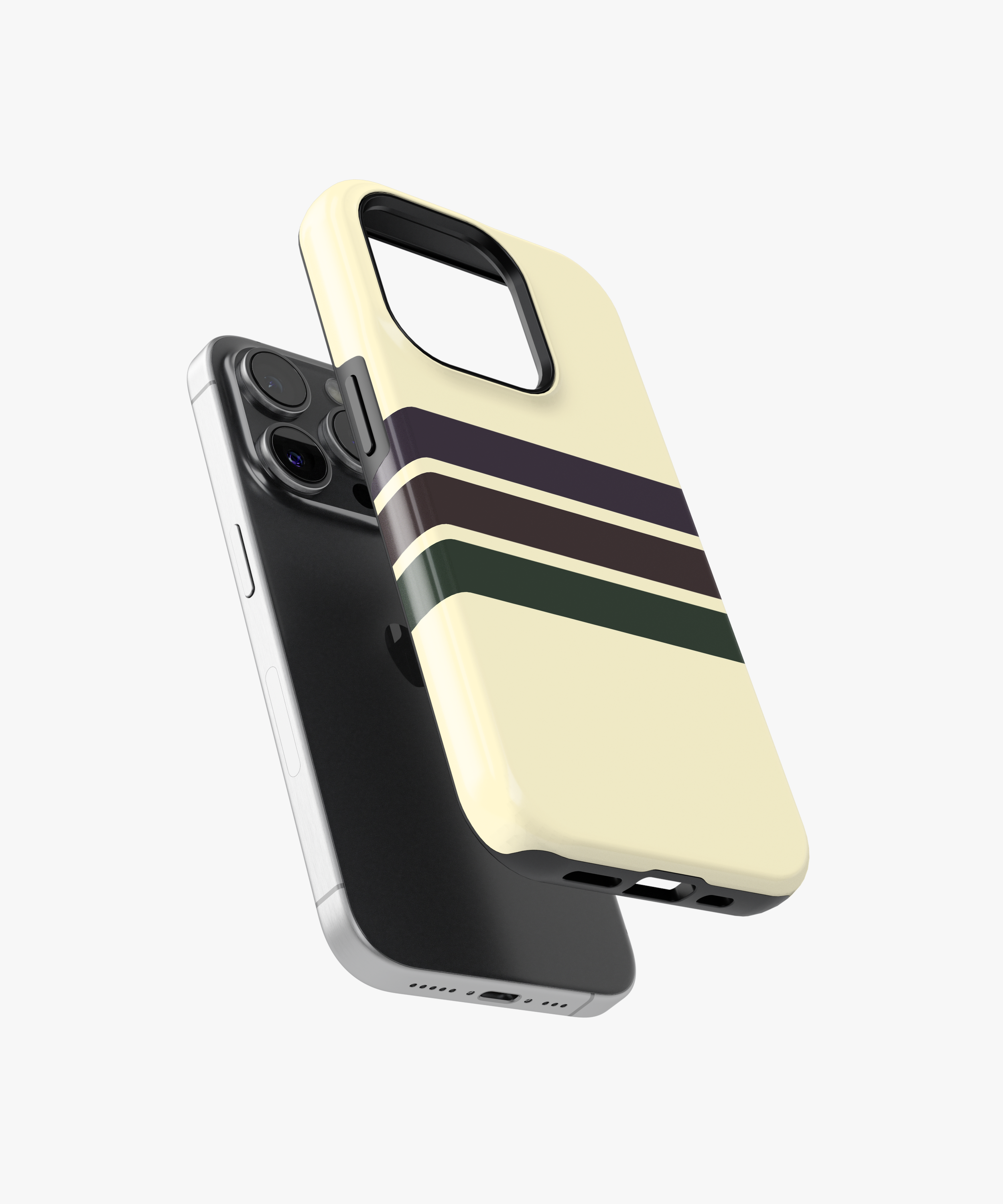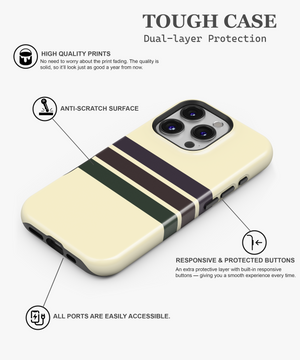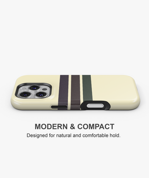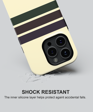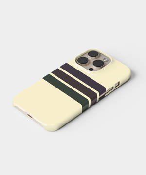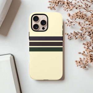 Soft cream phone case with clean retro stripes in deep brown and forest green for a subtle vintage collegiate look. Slim yet protective, this minimal striped cover guards against daily drops and scratches while fitting popular iPhone and Samsung models comfortably.