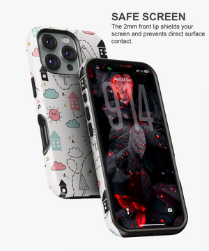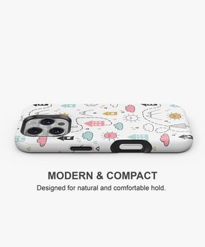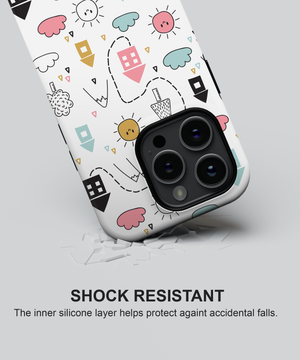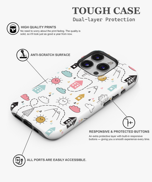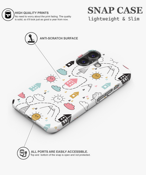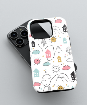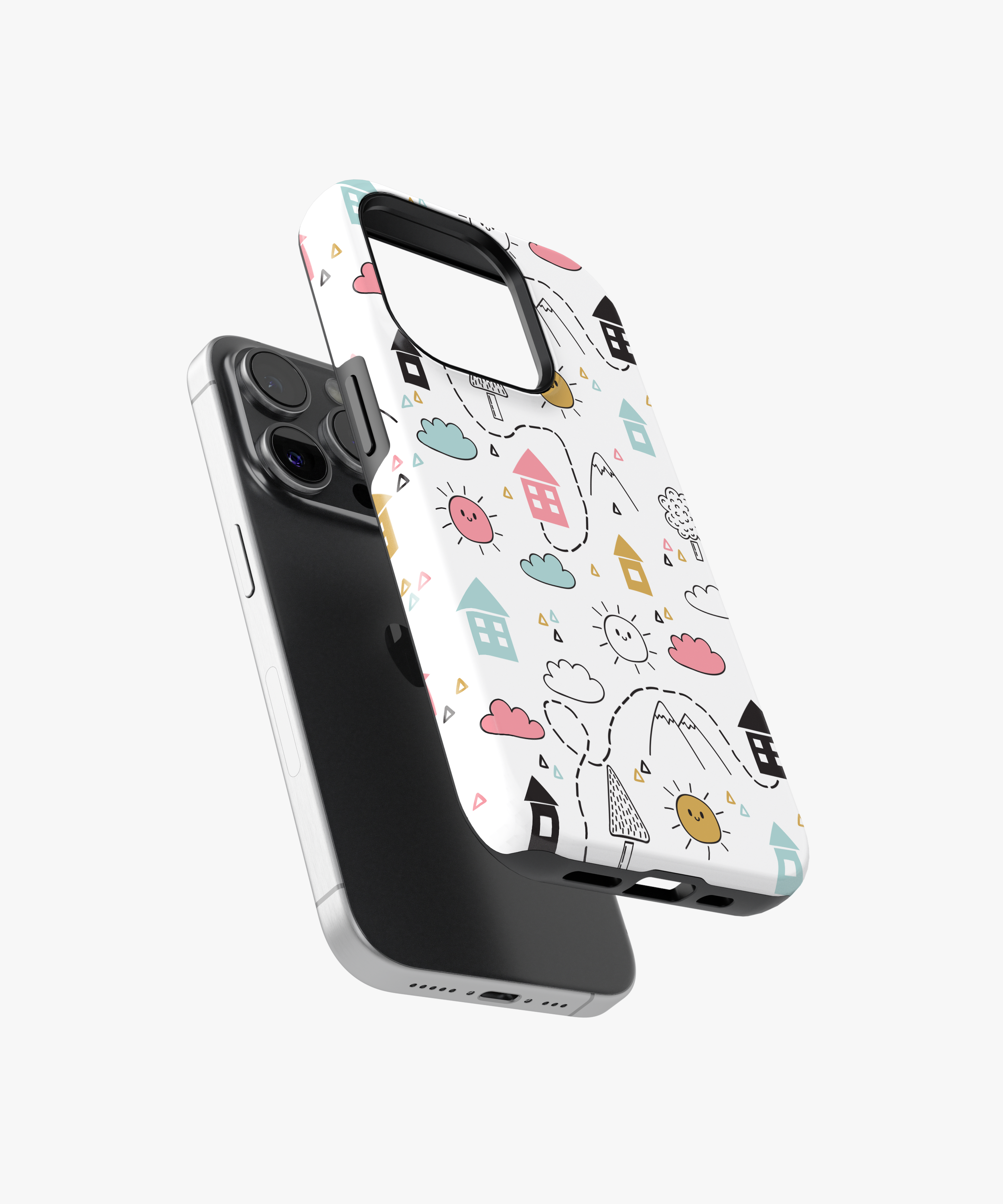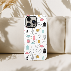This cute doodle town phone case features pastel houses, smiling suns, mountains, clouds, and playful dotted paths on a bright white background. It is perfect for girls, teens, kids, and doodle art lovers who enjoy fun, colorful, and aesthetic cartoon-style phone covers.