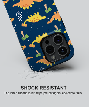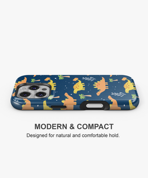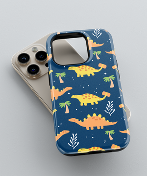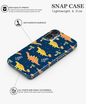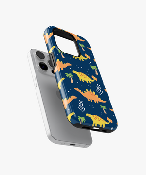 Playful dinosaurs roaming among starry palm trees on deep blue—like childhood adventures discovering prehistoric islands under endless night skies, this phone case design brings the joyful memory of imagination running wild with endless wonder.