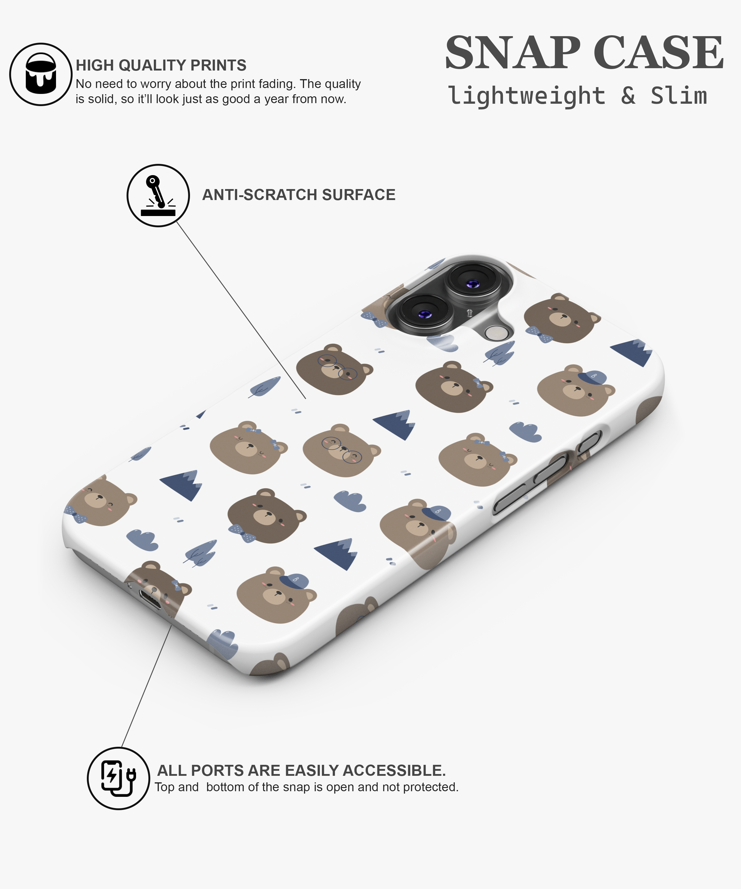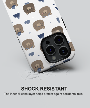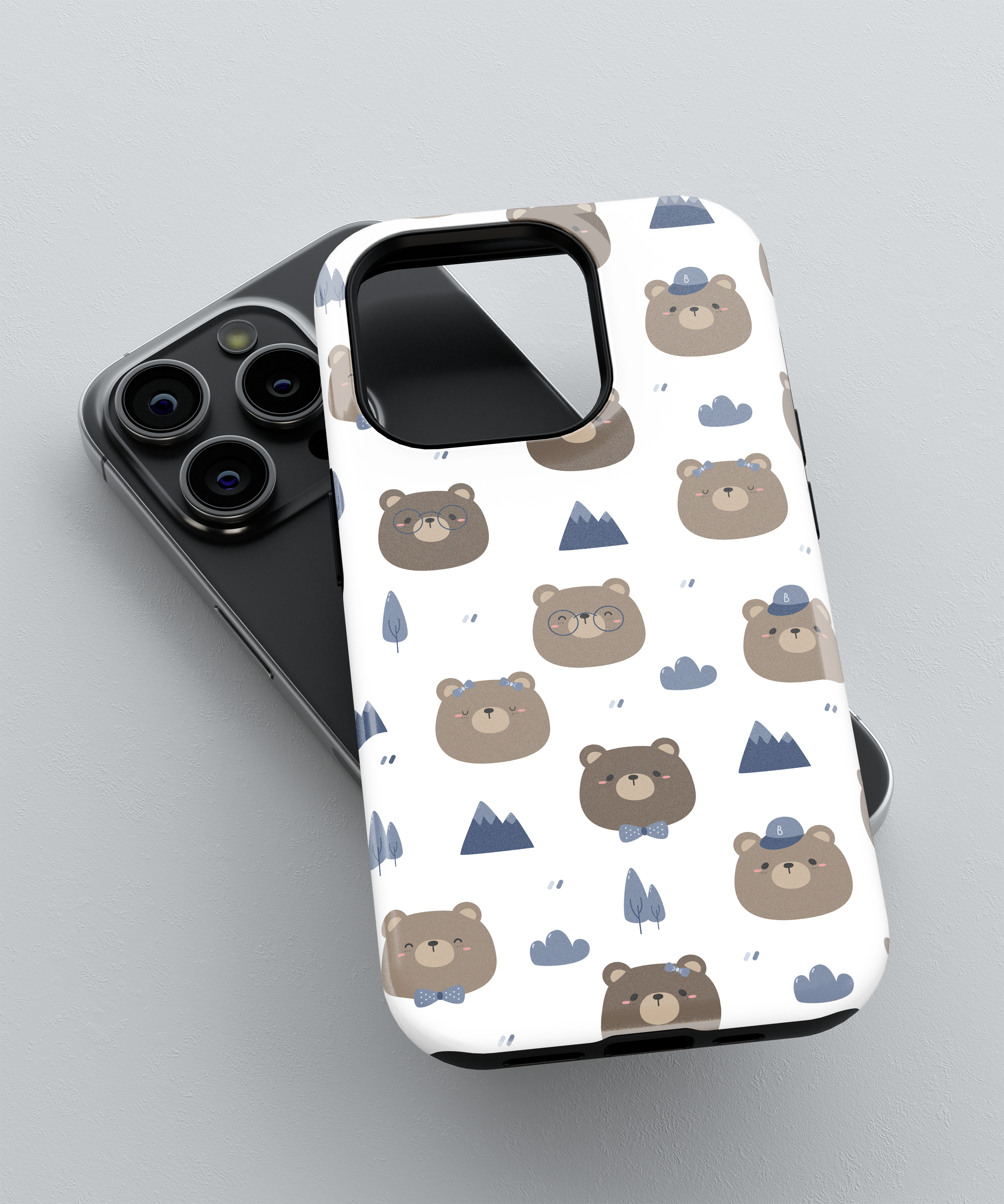 This kawaii bear camper phone case features adorable brown bears with glasses, hats, and bow ties surrounded by tiny mountains, trees, and clouds on a clean white background. It is perfect for girls, teens, kids, and nature lovers who enjoy cute animal designs, camping vibes, and soft pastel aesthetic phone covers