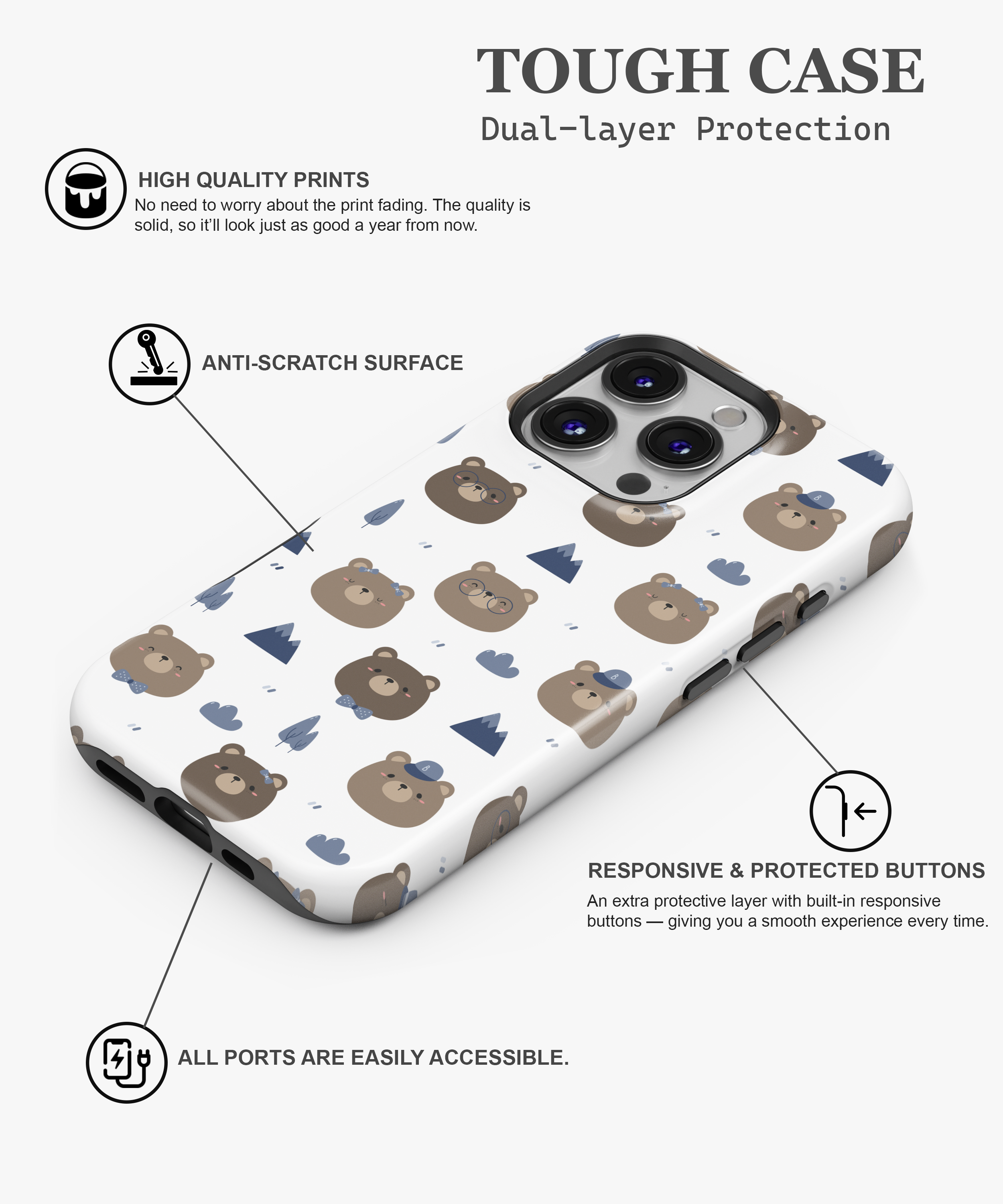 - Tough Cases: Hardshell PC exterior & inner soft TPU layer