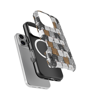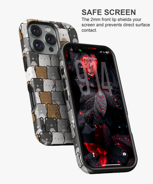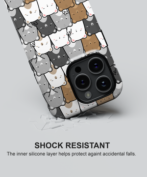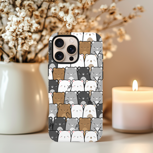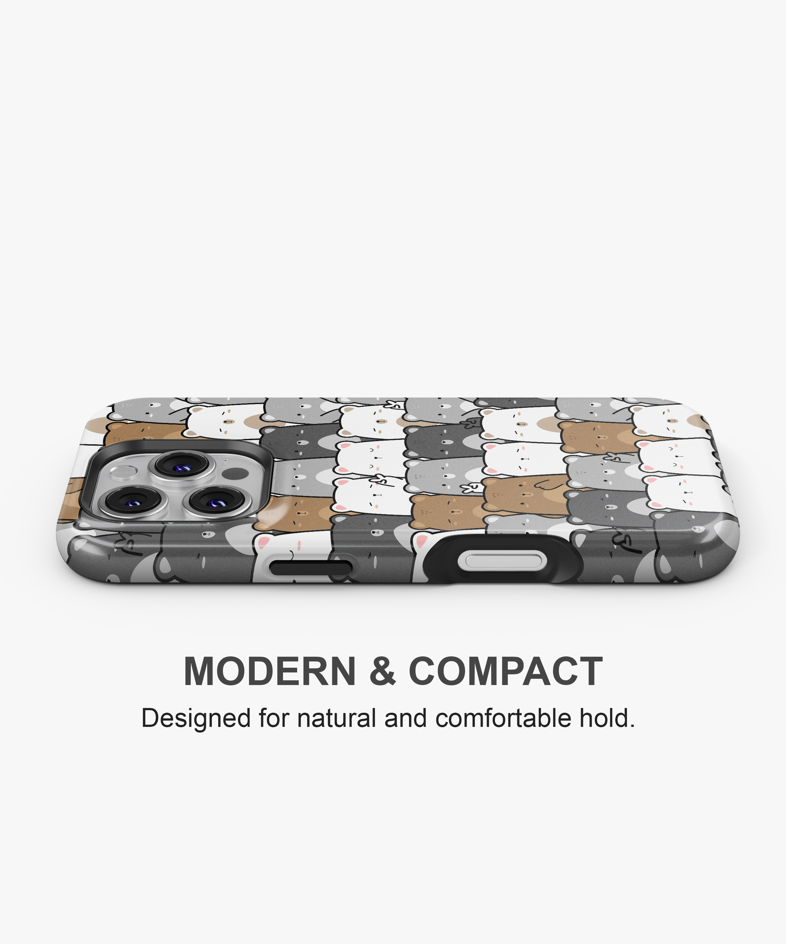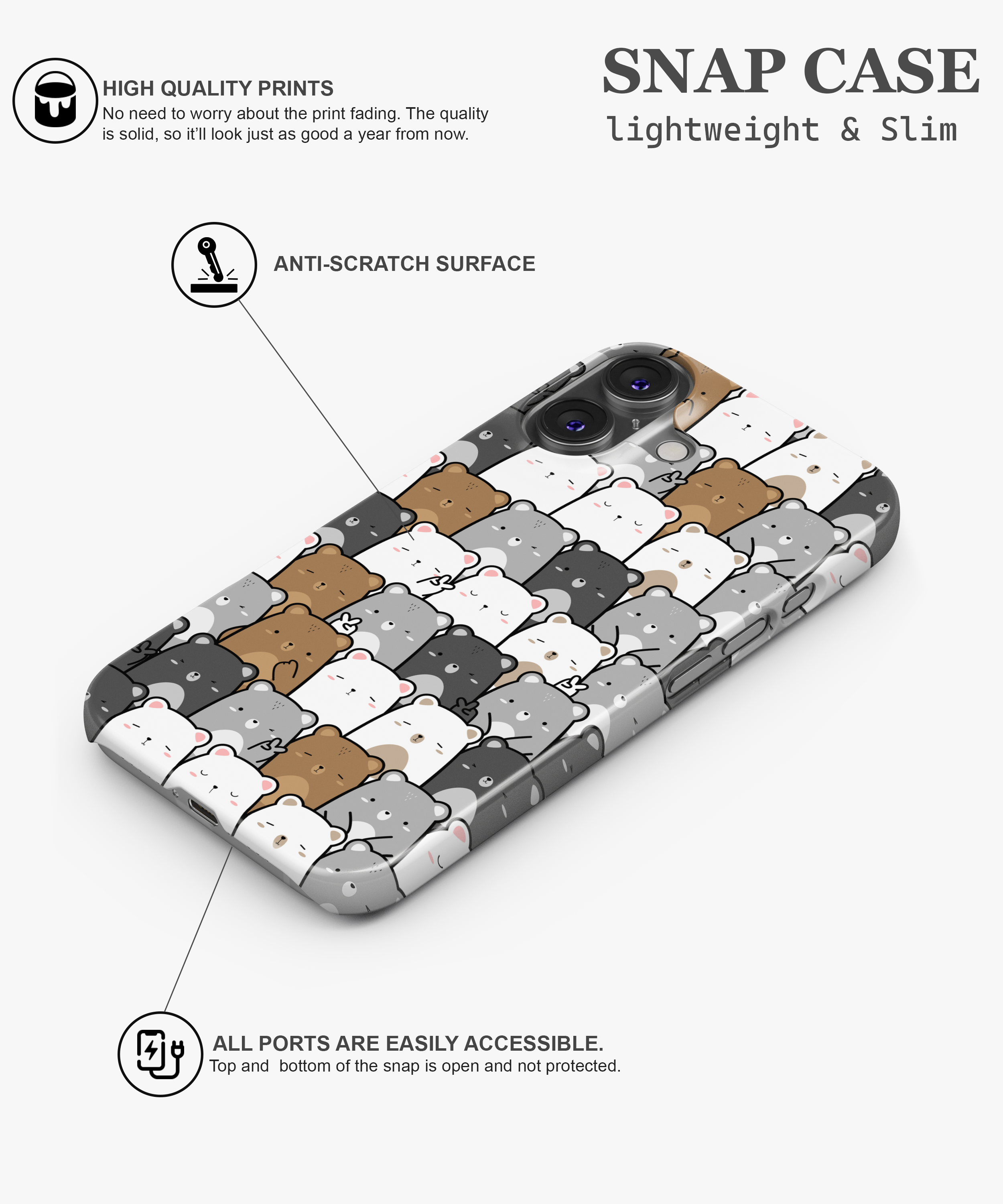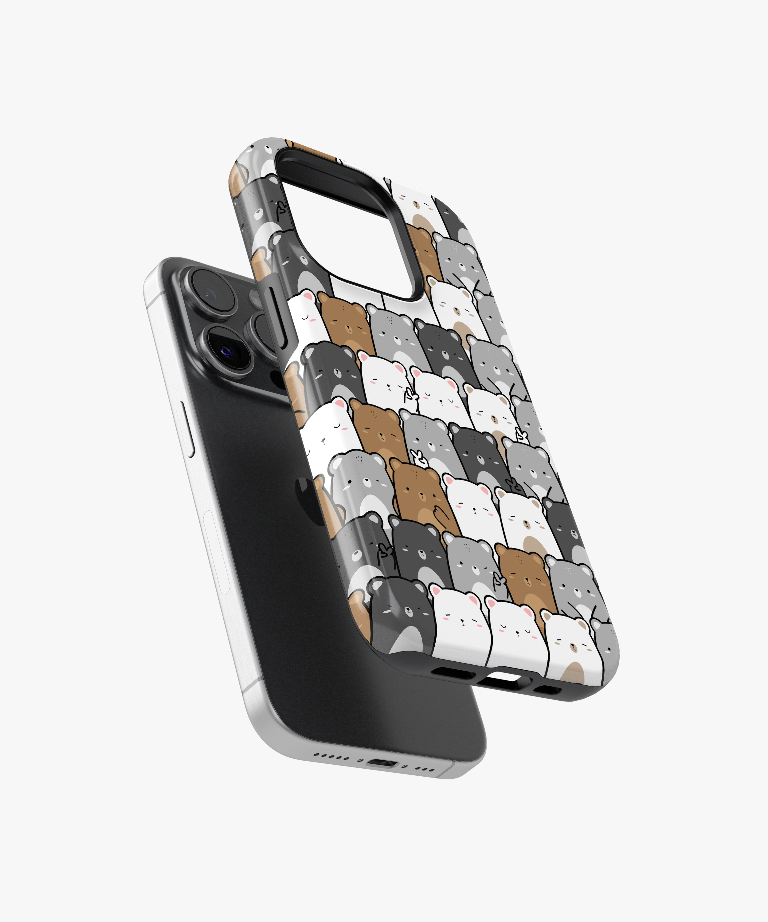 This kawaii bear crowd phone case shows rows of adorable bears in soft grey, brown, black, and white tones on a clean white background. It is perfect for girls, teens, and animal lovers who want a cozy, playful, and aesthetic phone cover.