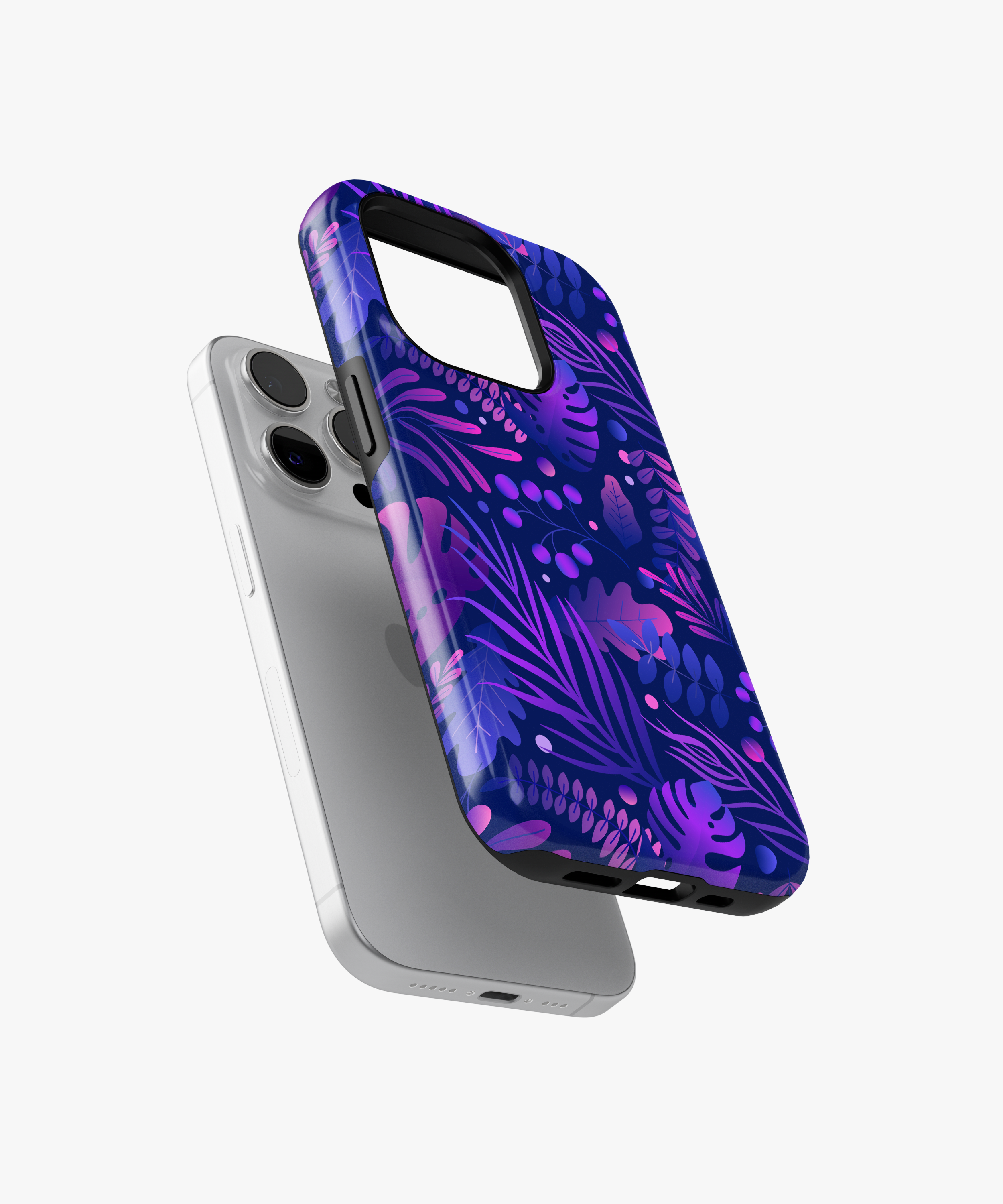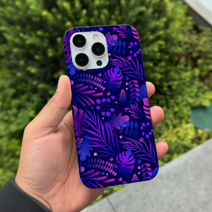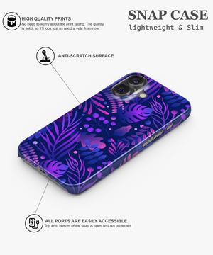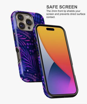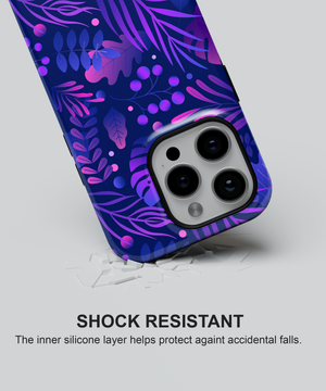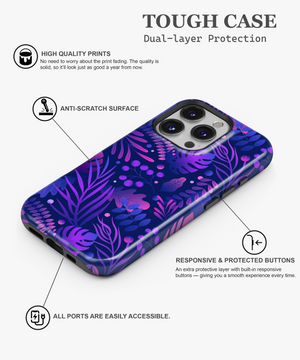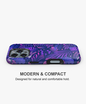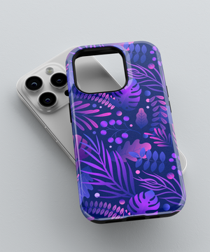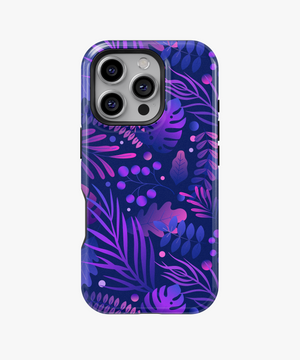 Bring bold nightlife vibes to your phone with this midnight jungle case featuring layered tropical leaves and berries in neon purples and blues on a deep navy background.