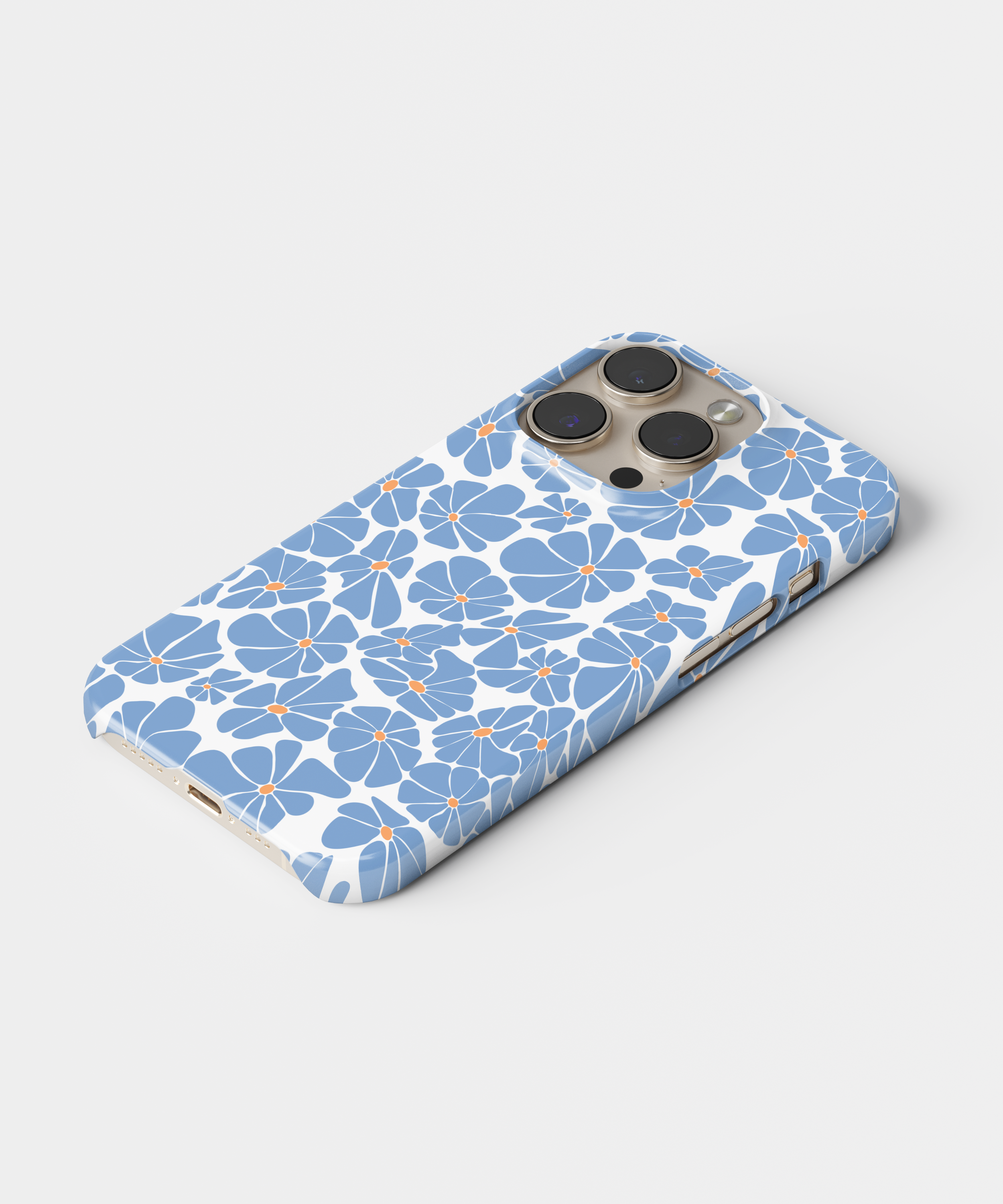 Soft pastel blue flowers with orange centers scatter across a crisp white background, creating a clean, minimal floral pattern that feels fresh, playful, and modern