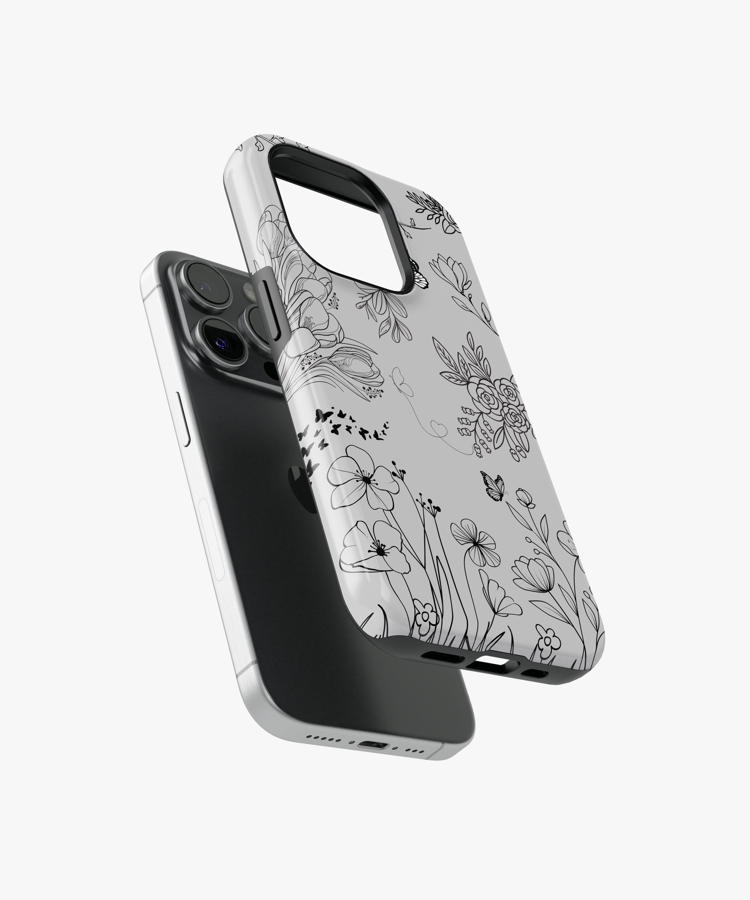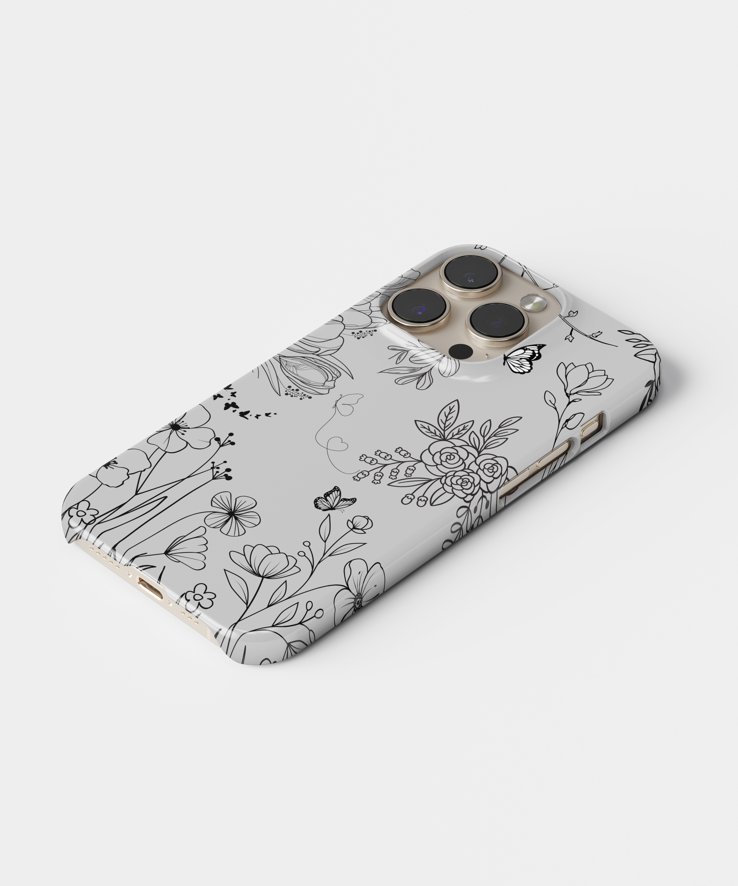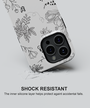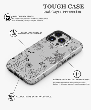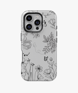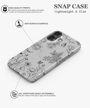 This minimal line art floral phone case features delicate black flowers and butterflies on a soft grey background. It is perfect for anyone who loves a clean, elegant, and modern nature-inspired look on their phone.