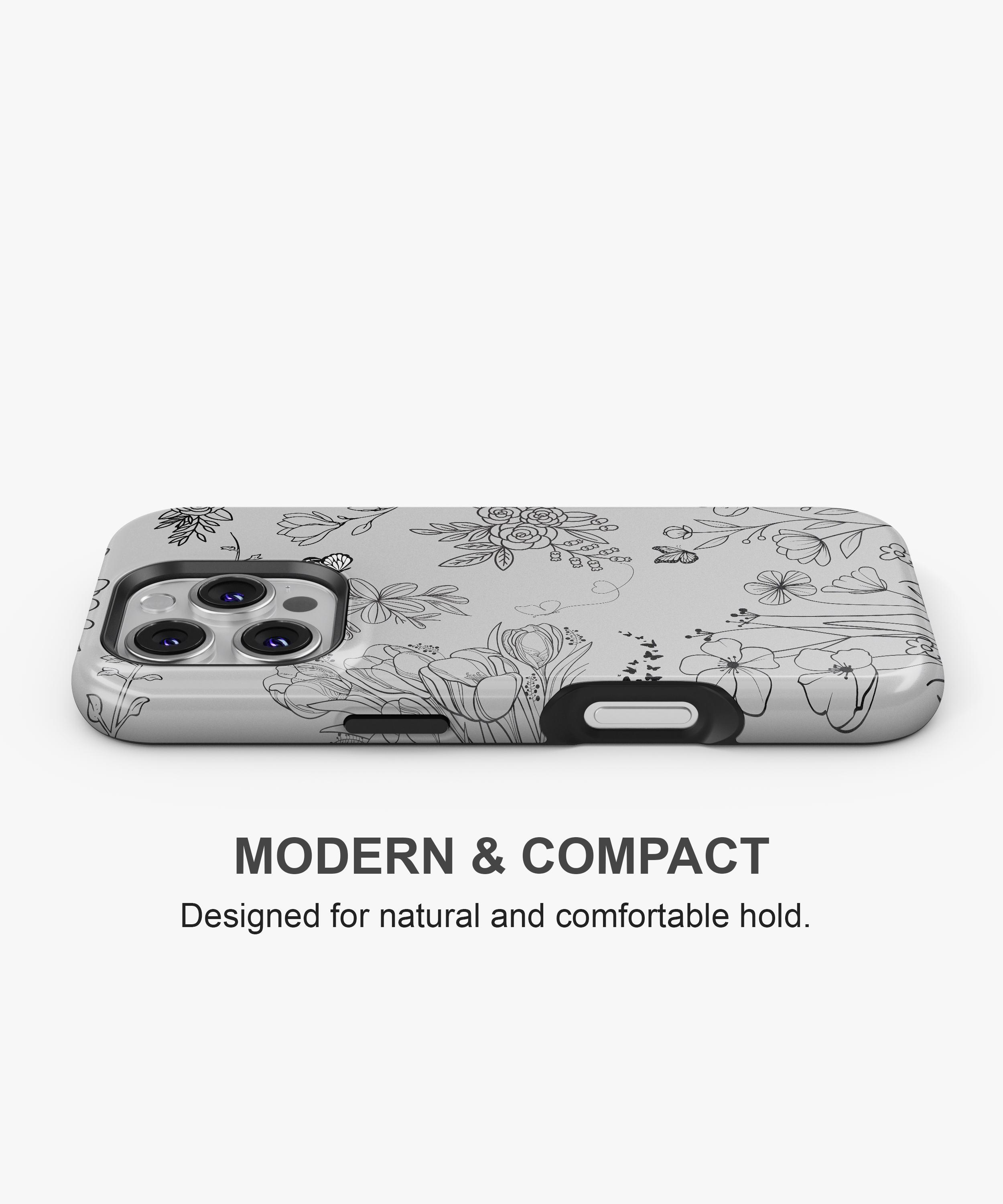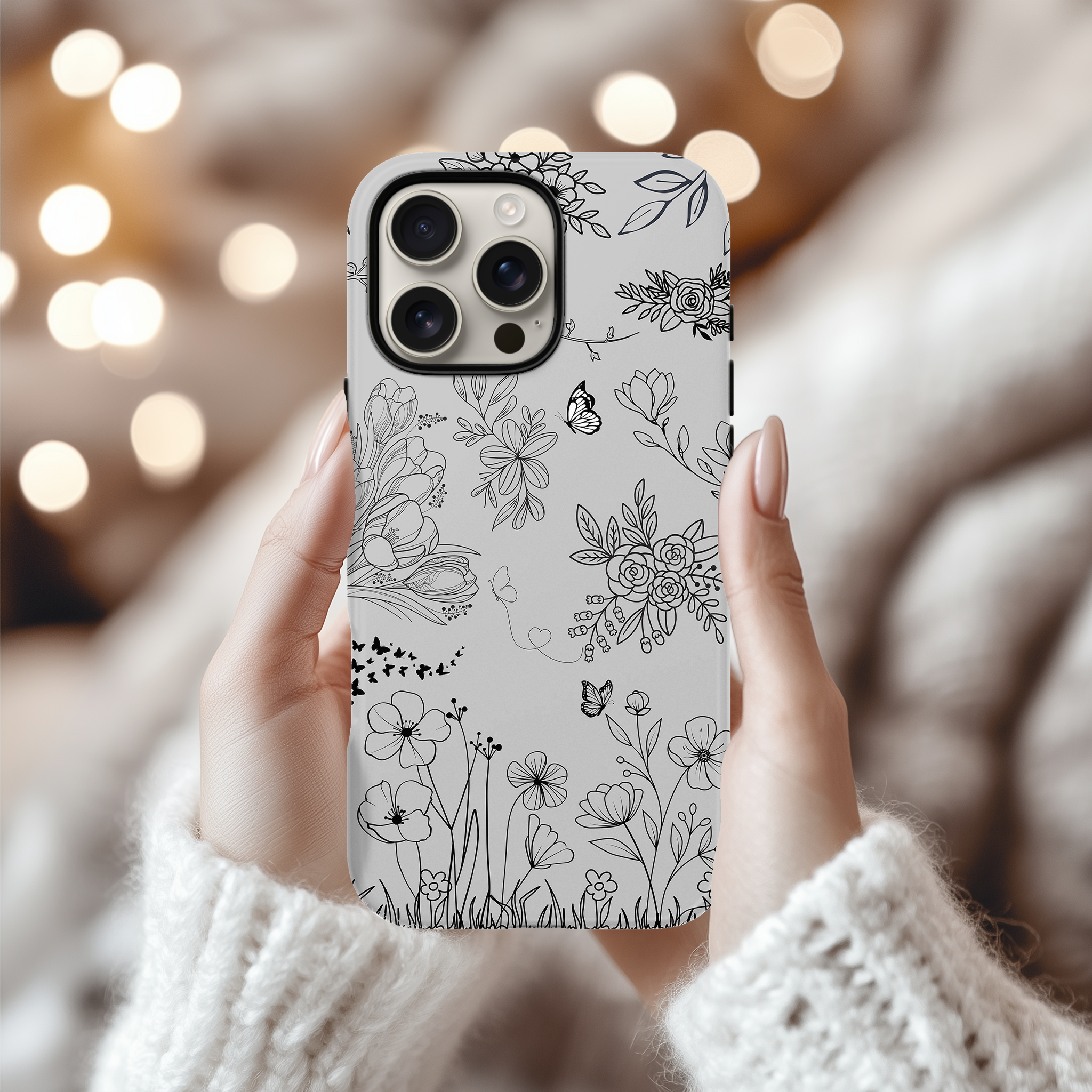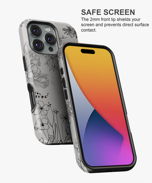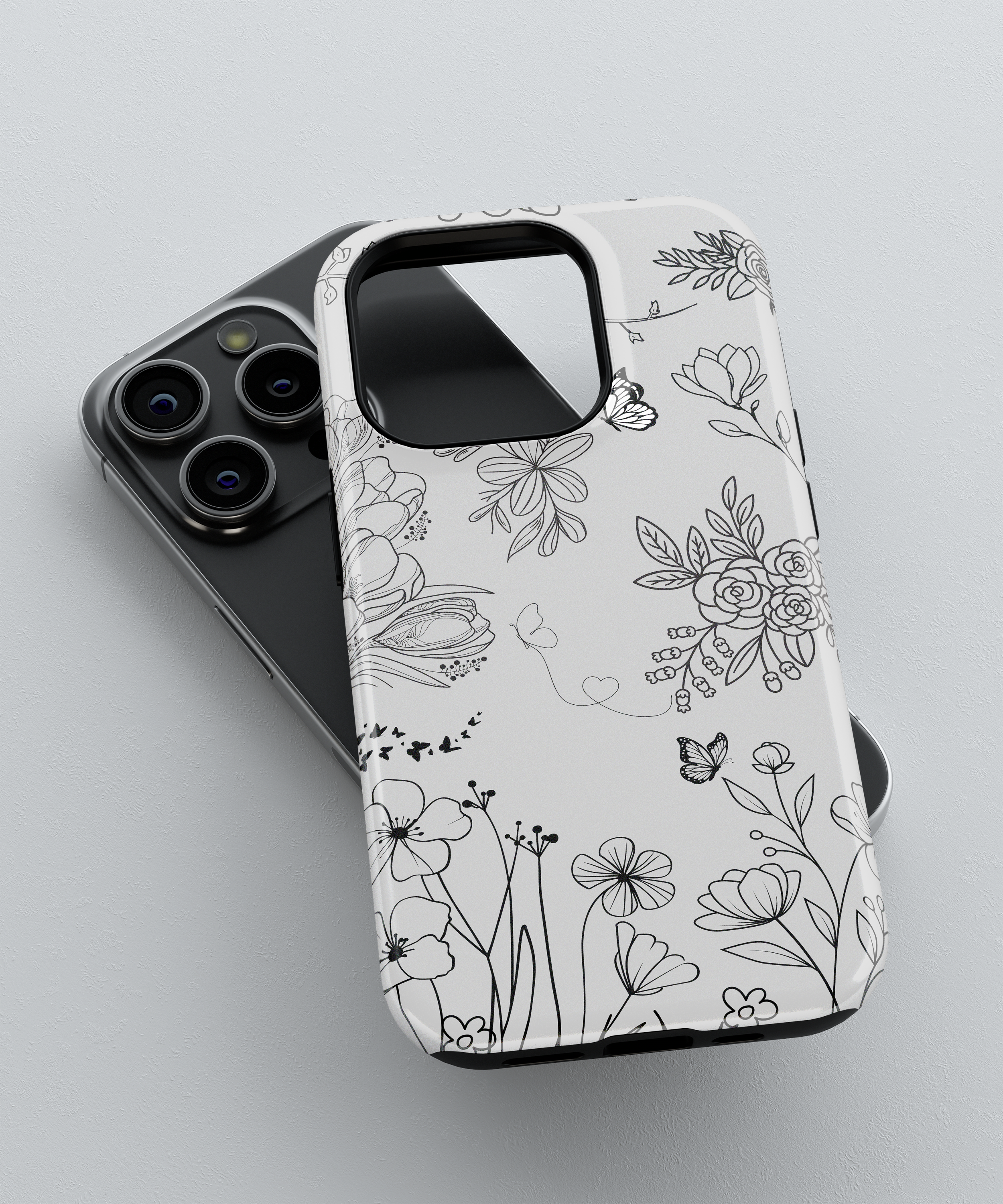 This minimal line art floral phone case features delicate black flowers and butterflies on a soft grey background. It is perfect for anyone who loves a clean, elegant, and modern nature-inspired look on their phone.