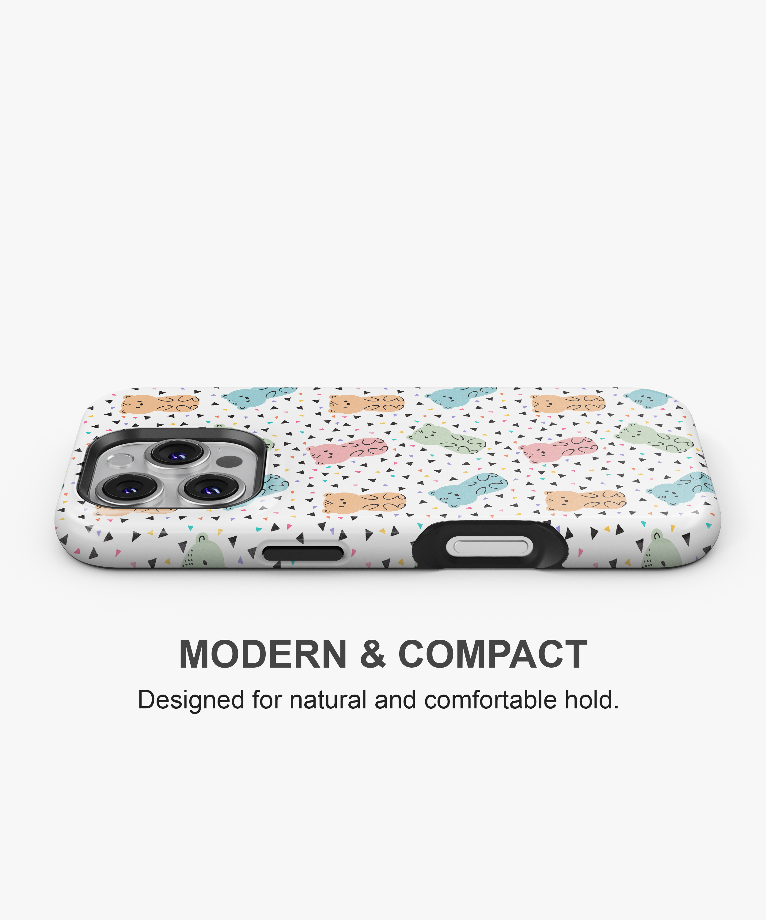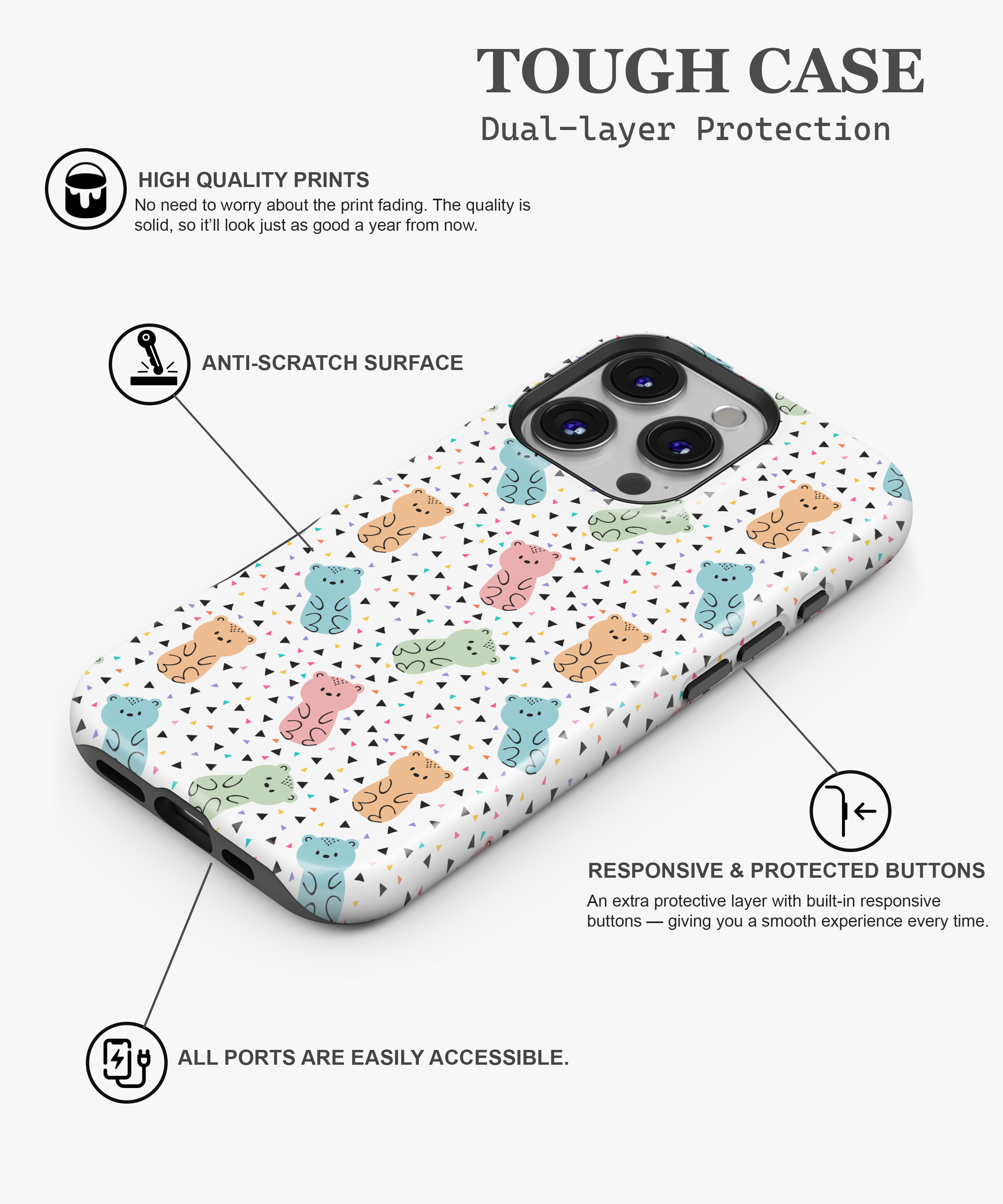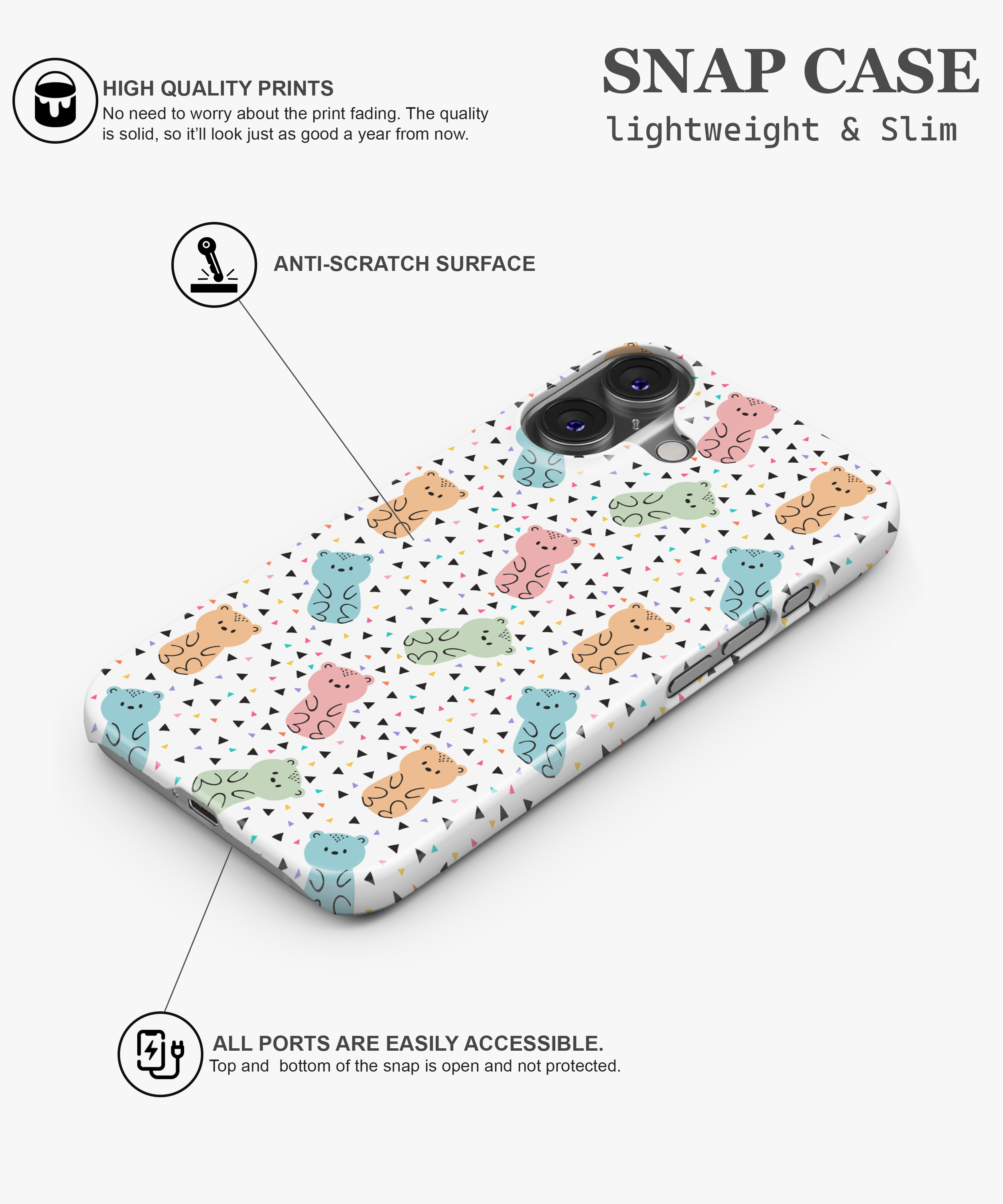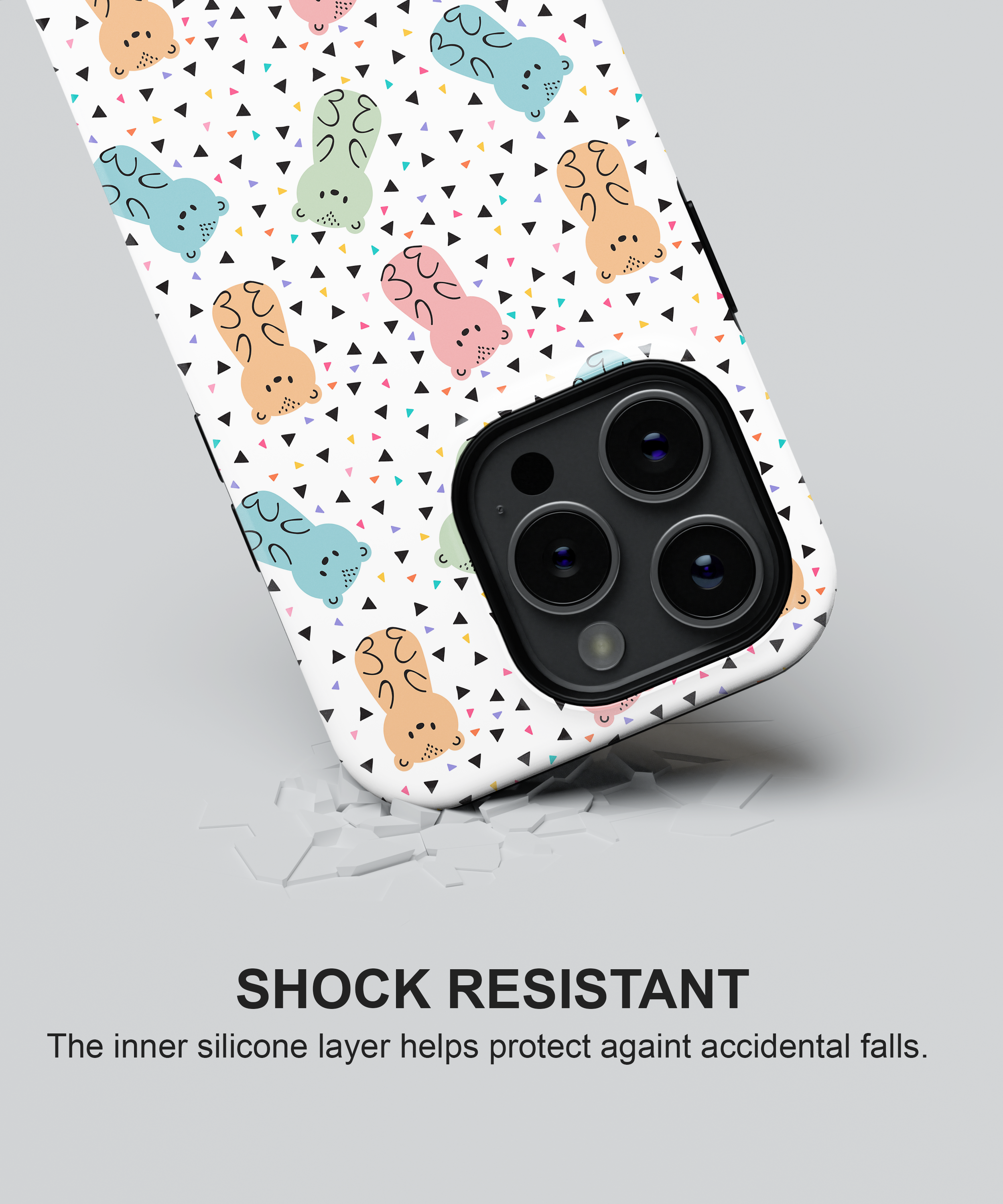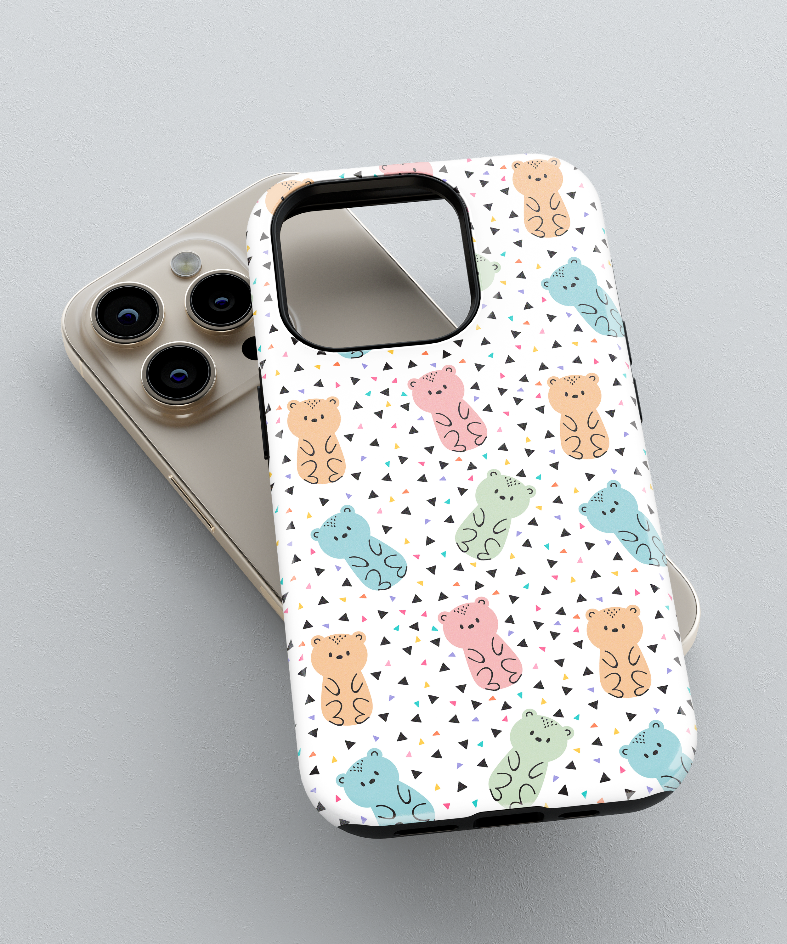 This pastel bear phone case features adorable colorful bears in peach, blue, green, and yellow with tiny confetti triangles on a clean white background. It is perfect for girls, teens, and kawaii lovers who want a fun, playful, and aesthetic phone cover.1.jpg