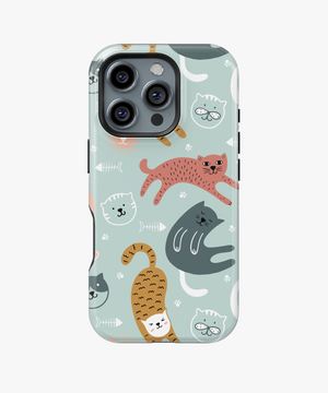 This playful cats phone case features colorful kitties in coral, mustard, grey, and white with fish bones and paw prints on a soft mint green background. It is perfect for girls, teens, and cat lovers who enjoy fun cartoon cat art, kawaii pet designs, and bright aesthetic phone covers.