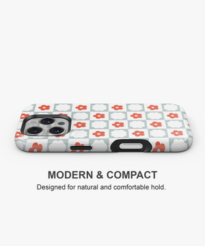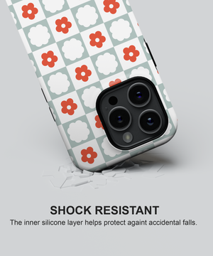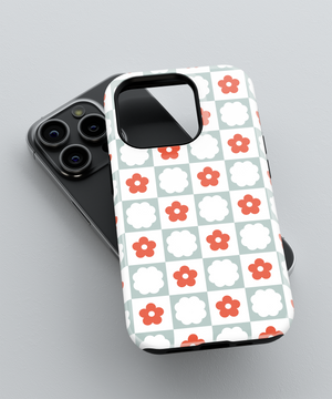 Red daisies dancing across crisp white checkers—like wildflower meadows swaying in gentle summer winds, this phone case design brings the carefree memory of barefoot days chasing butterflies through endless fields of bloom.