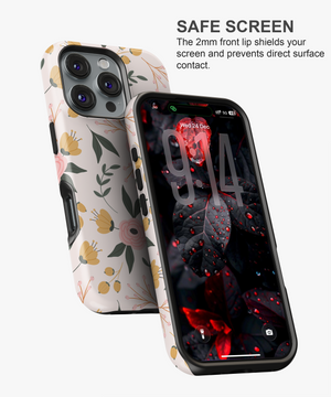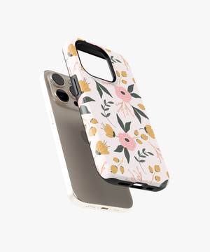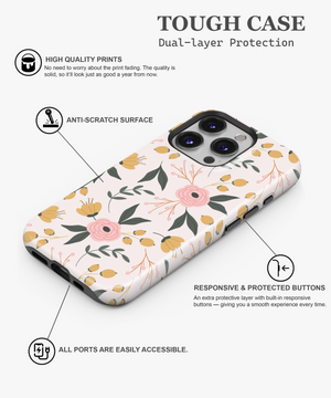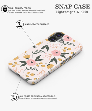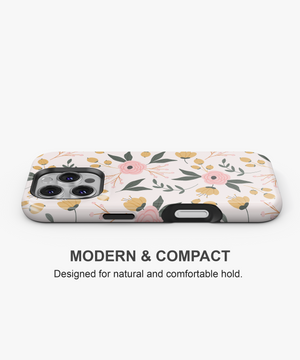 This soft floral phone case features pastel pink blossoms and yellow buds with green leaves on a warm cream background. It is perfect for girls and nature lovers who want a gentle, romantic, and everyday aesthetic phone cover.