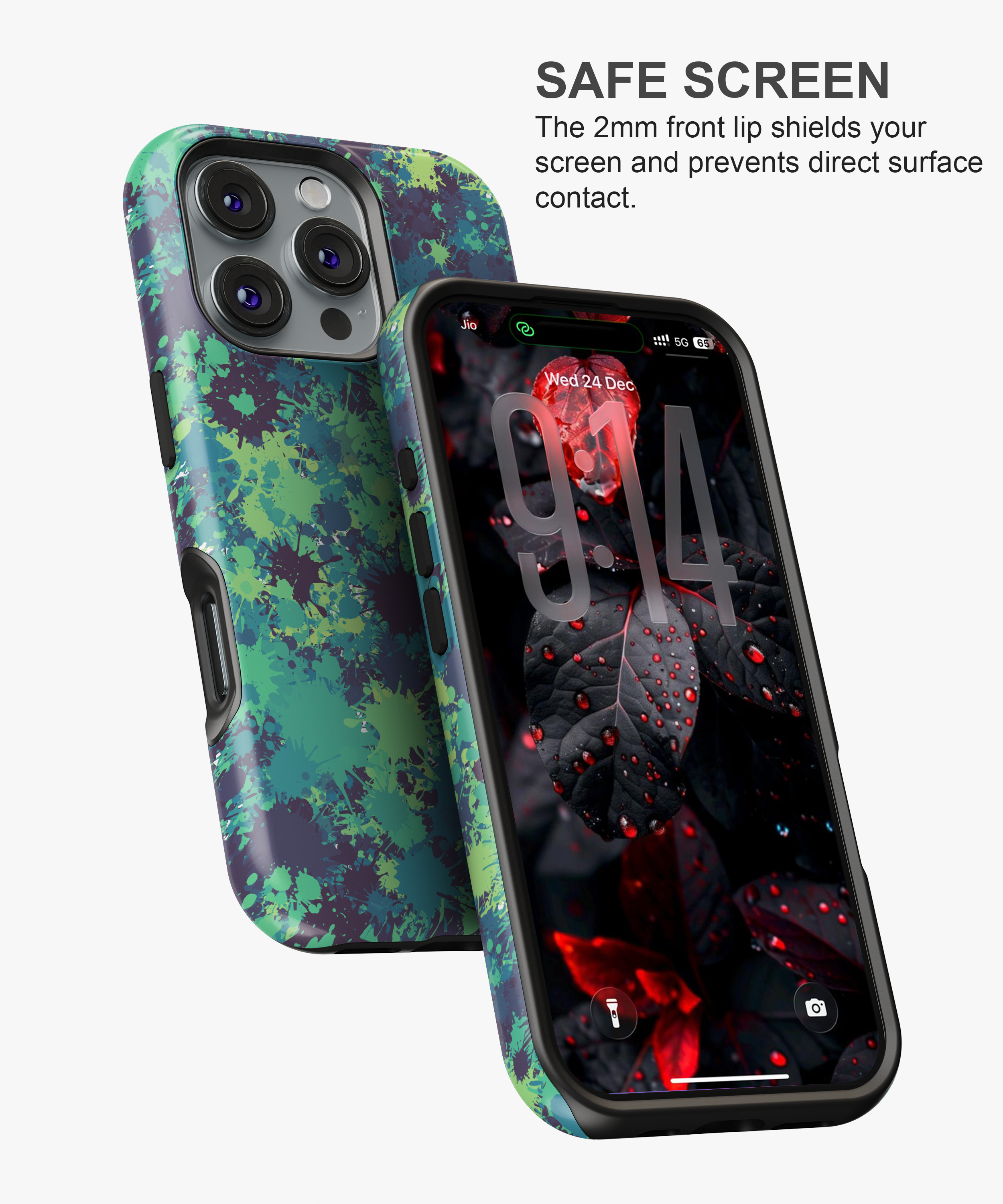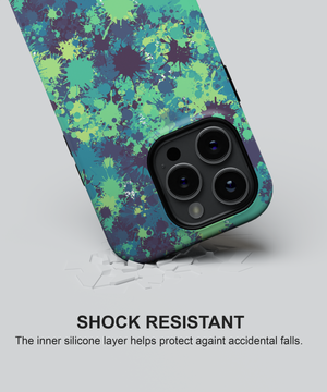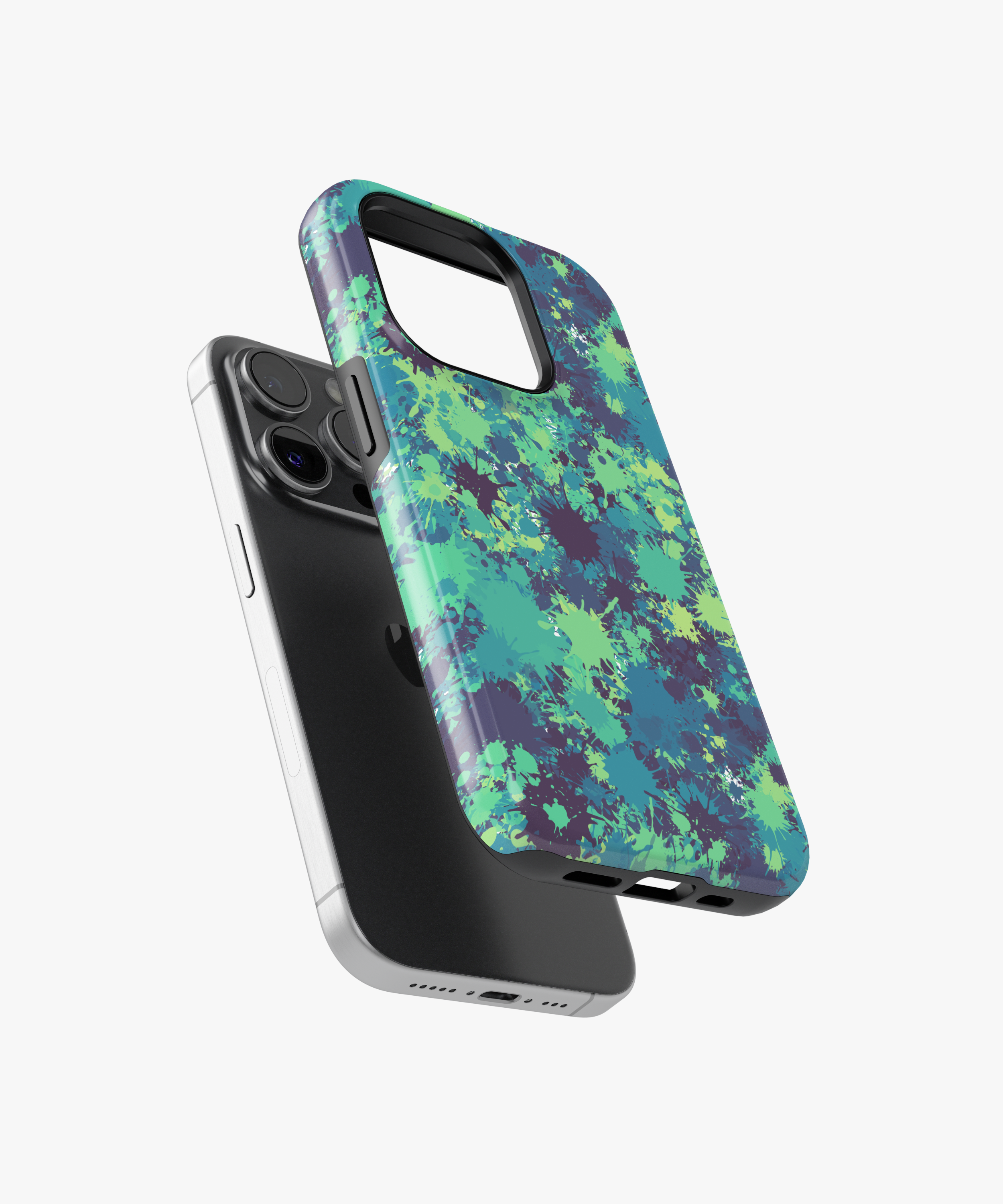 Turn everyday protection into statement style with a bold teal, green, and purple paint-splatter print inspired by street art and abstract grunge textures
