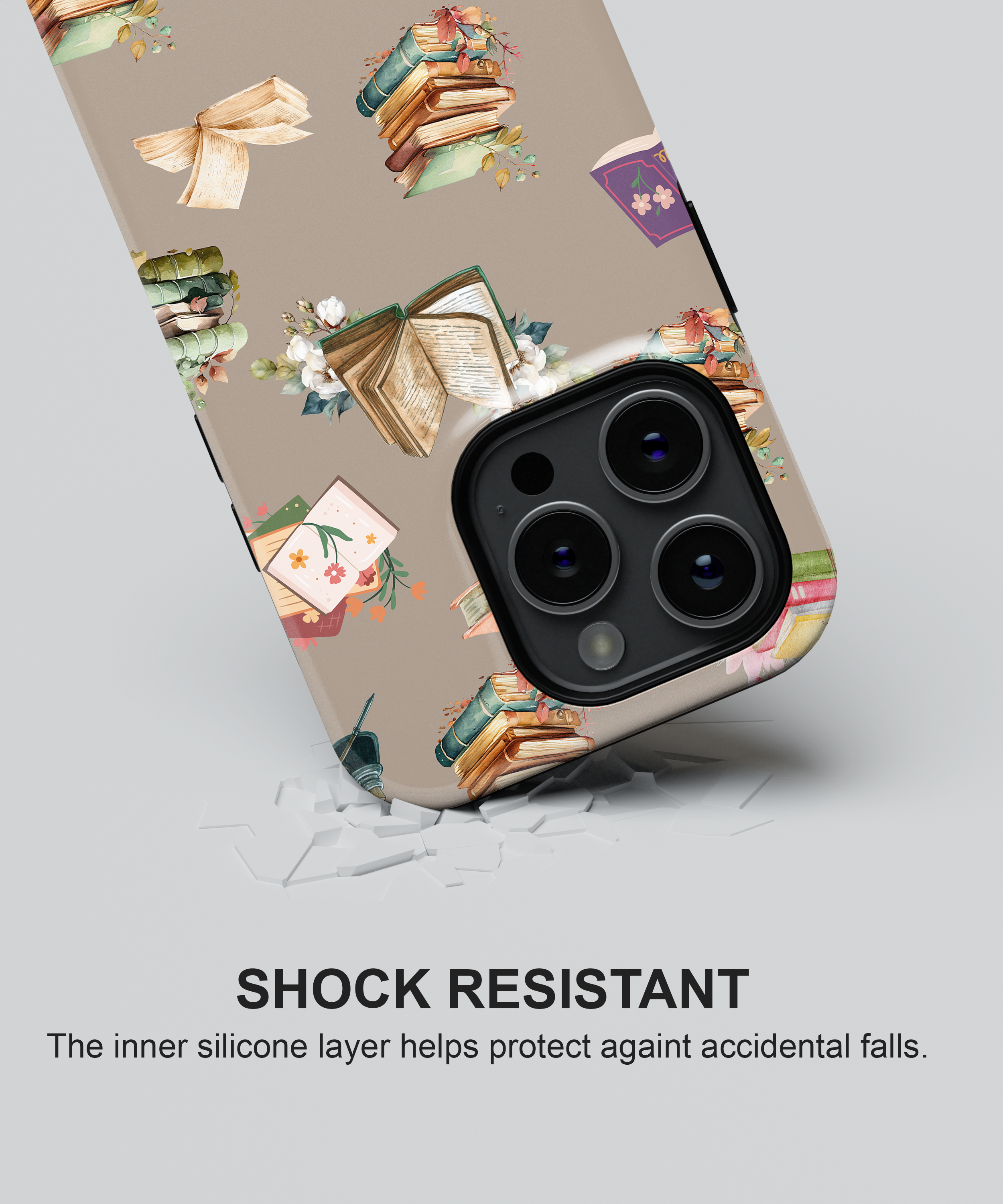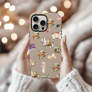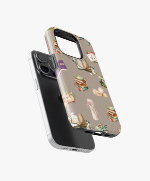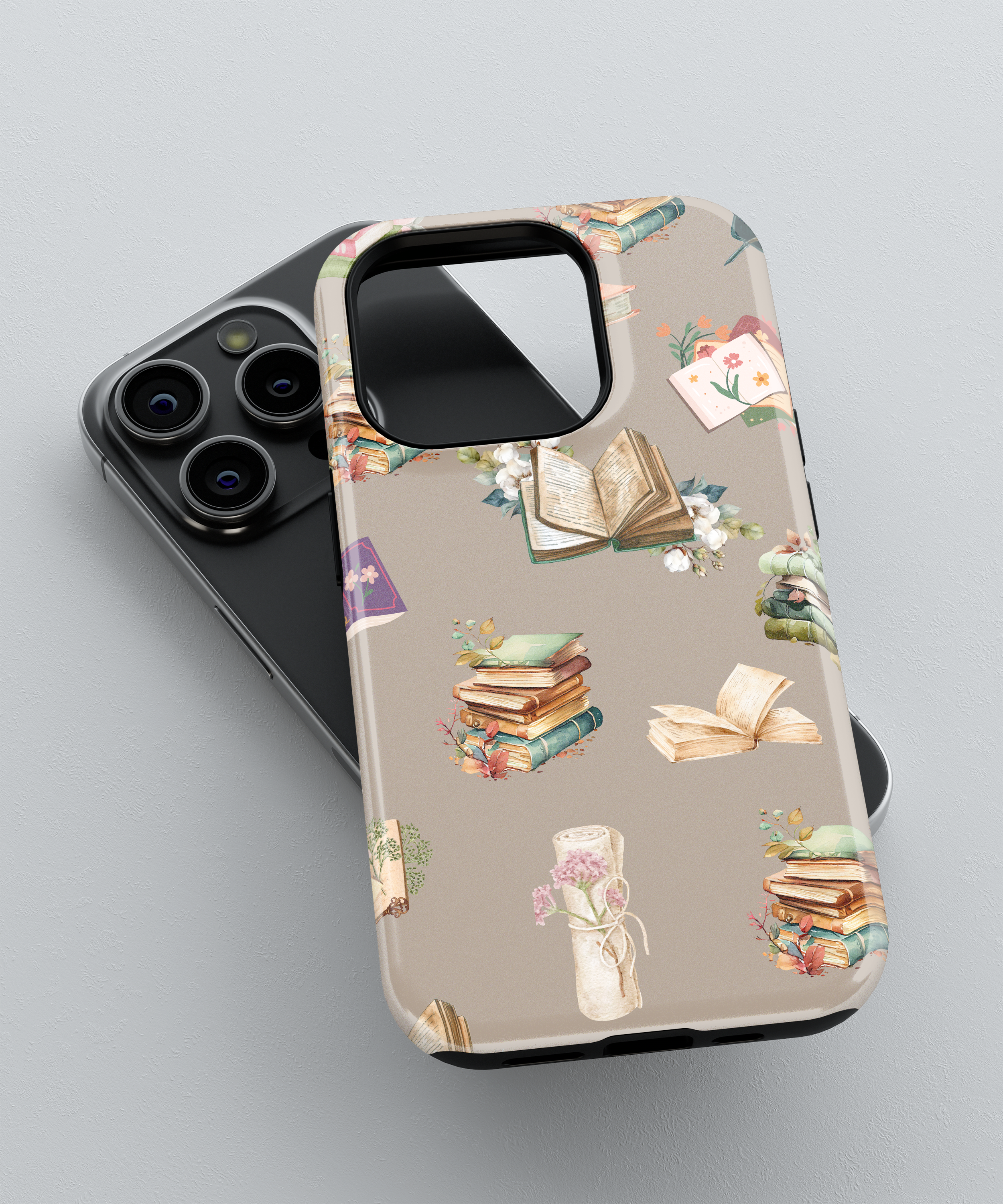 This vintage book phone case shows stacks of old books, open pages, letters, and flowers on a soft taupe background. It is perfect for book lovers, students, writers, and anyone who loves cozy aesthetic library vibes on their phone.
